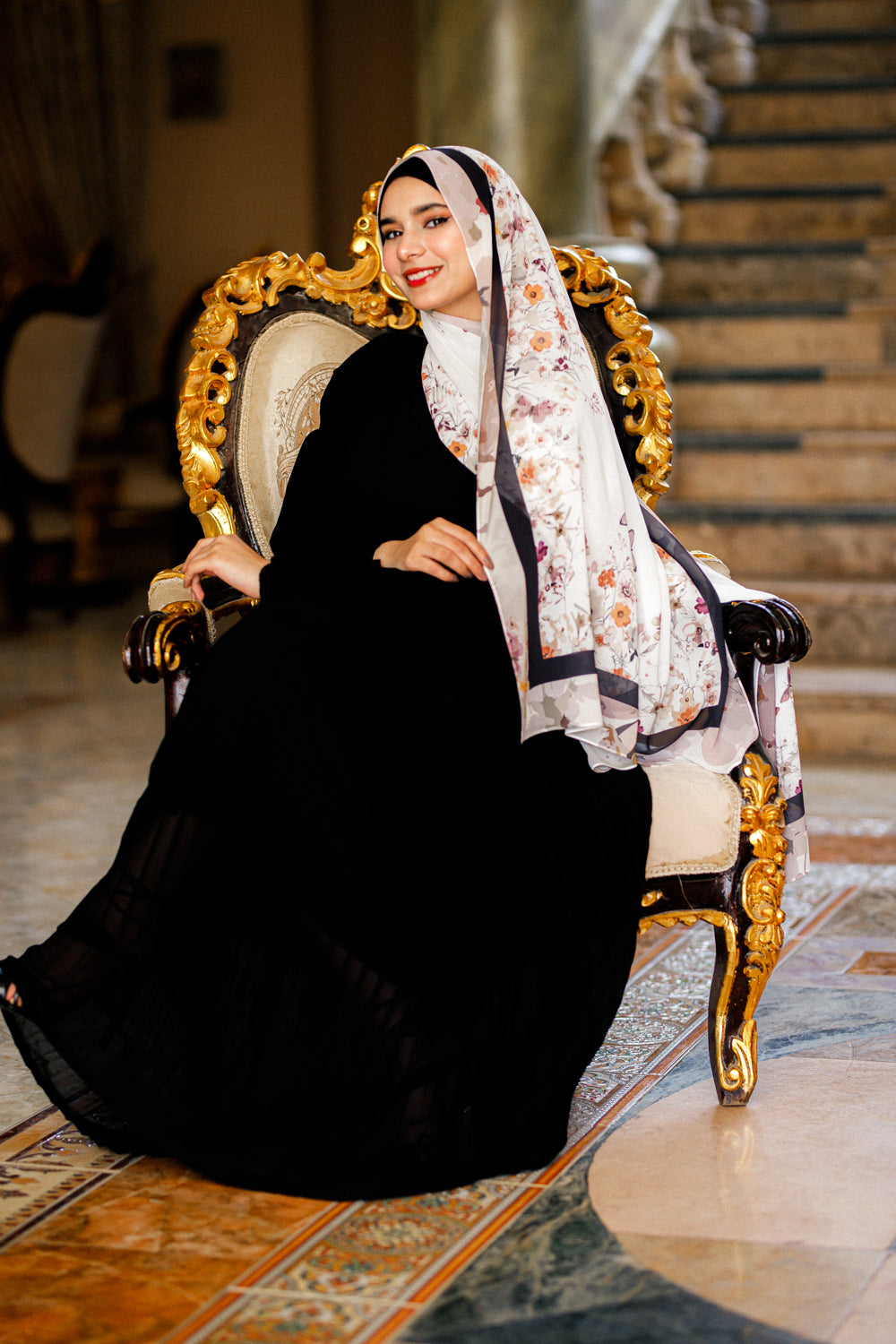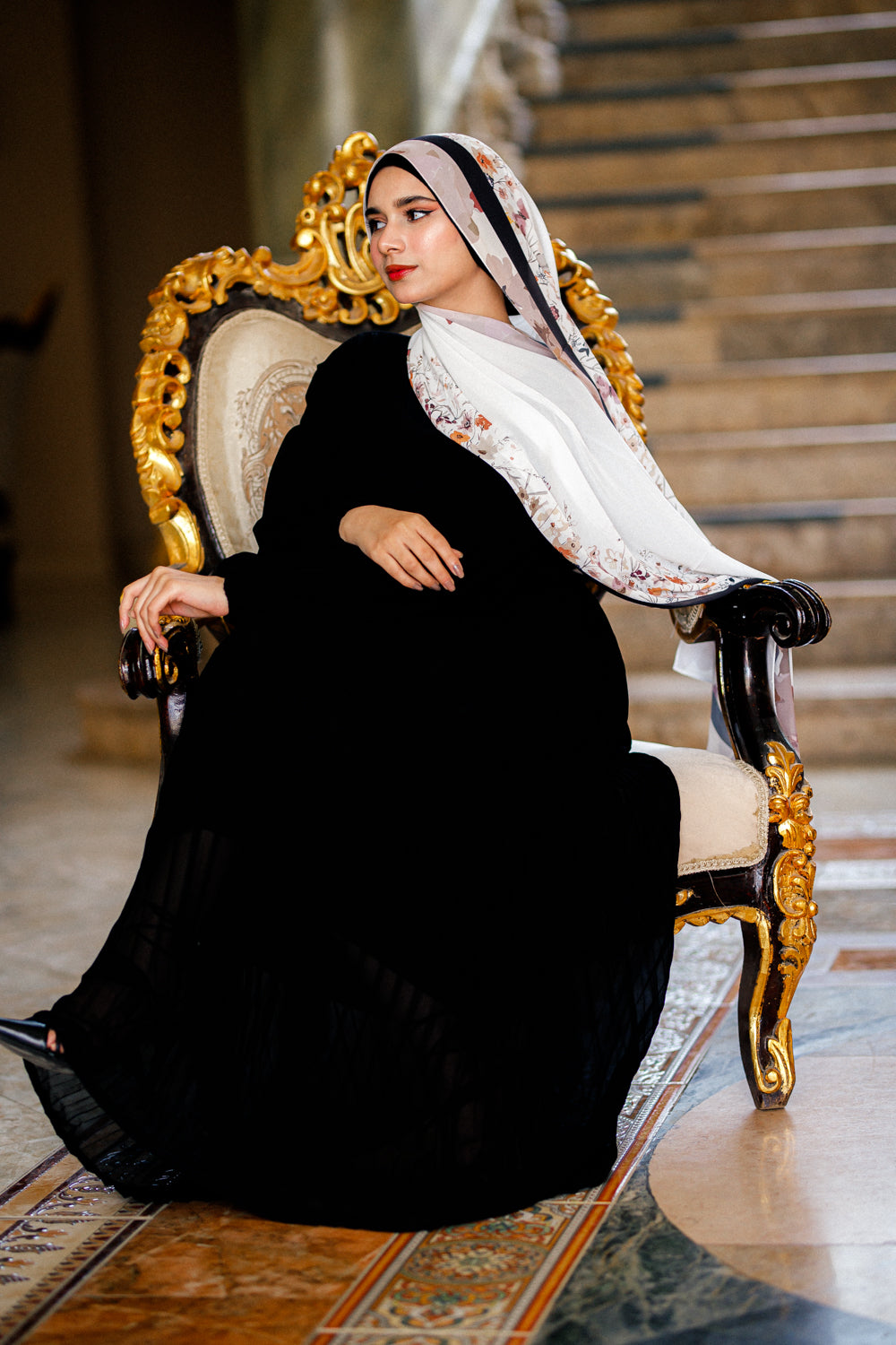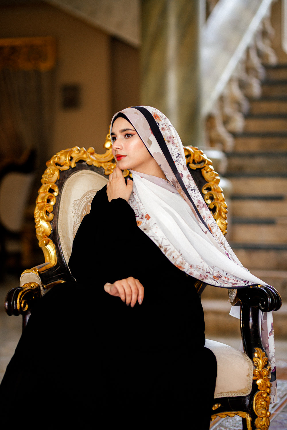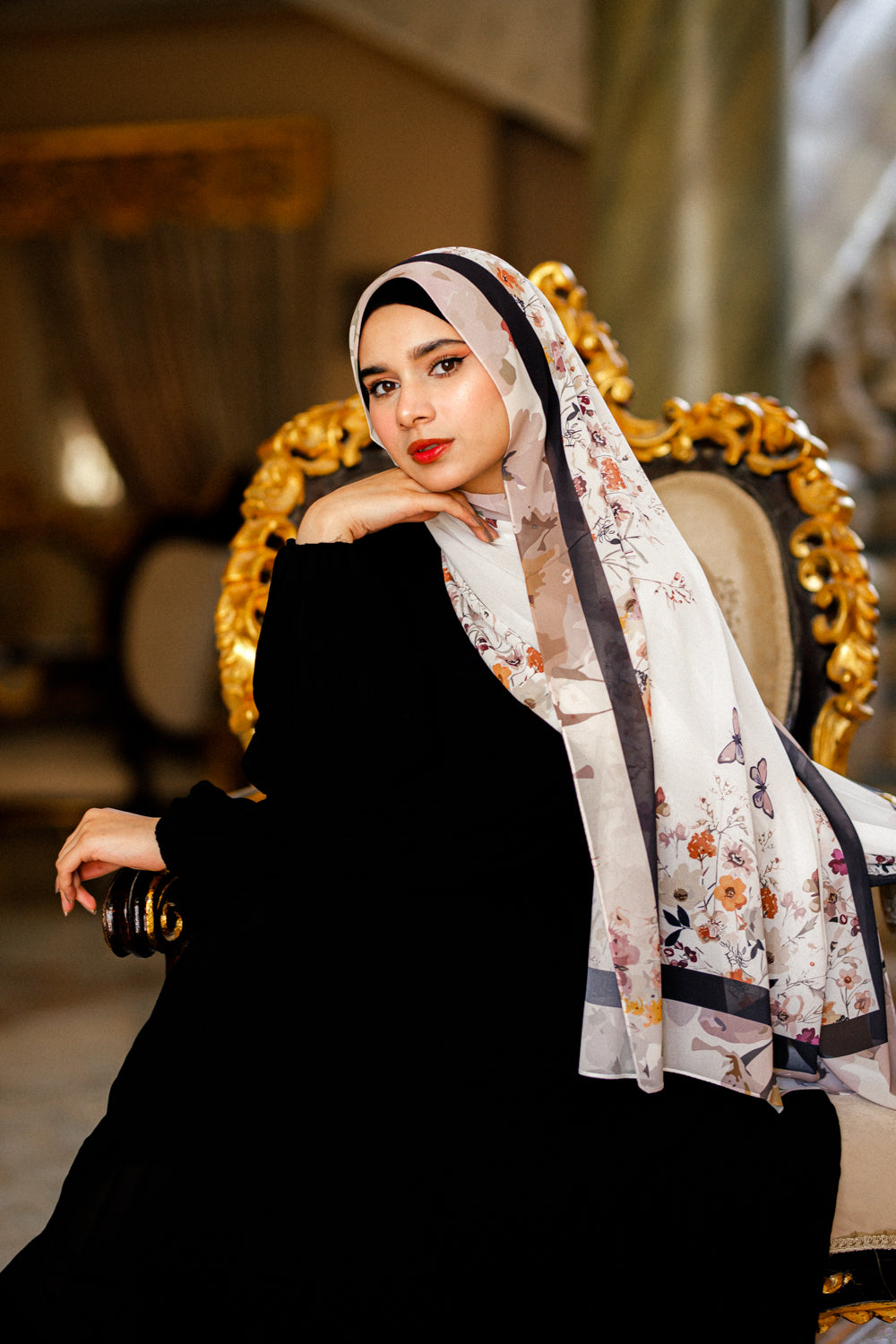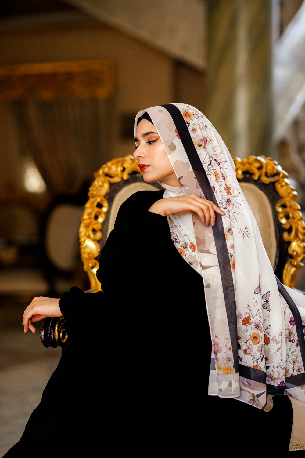 تنسيق متناسق من الأزهار الرقيقة بألوان محايدة دافئة يُحيط بمركز أبيض نقي، تُبرزه حافة أنيقة. يُضفي هذا التصميم الأنيق سحرًا أنثويًا هادئًا، مما يجعله إضافةً خالدة لأي خزانة ملابس.