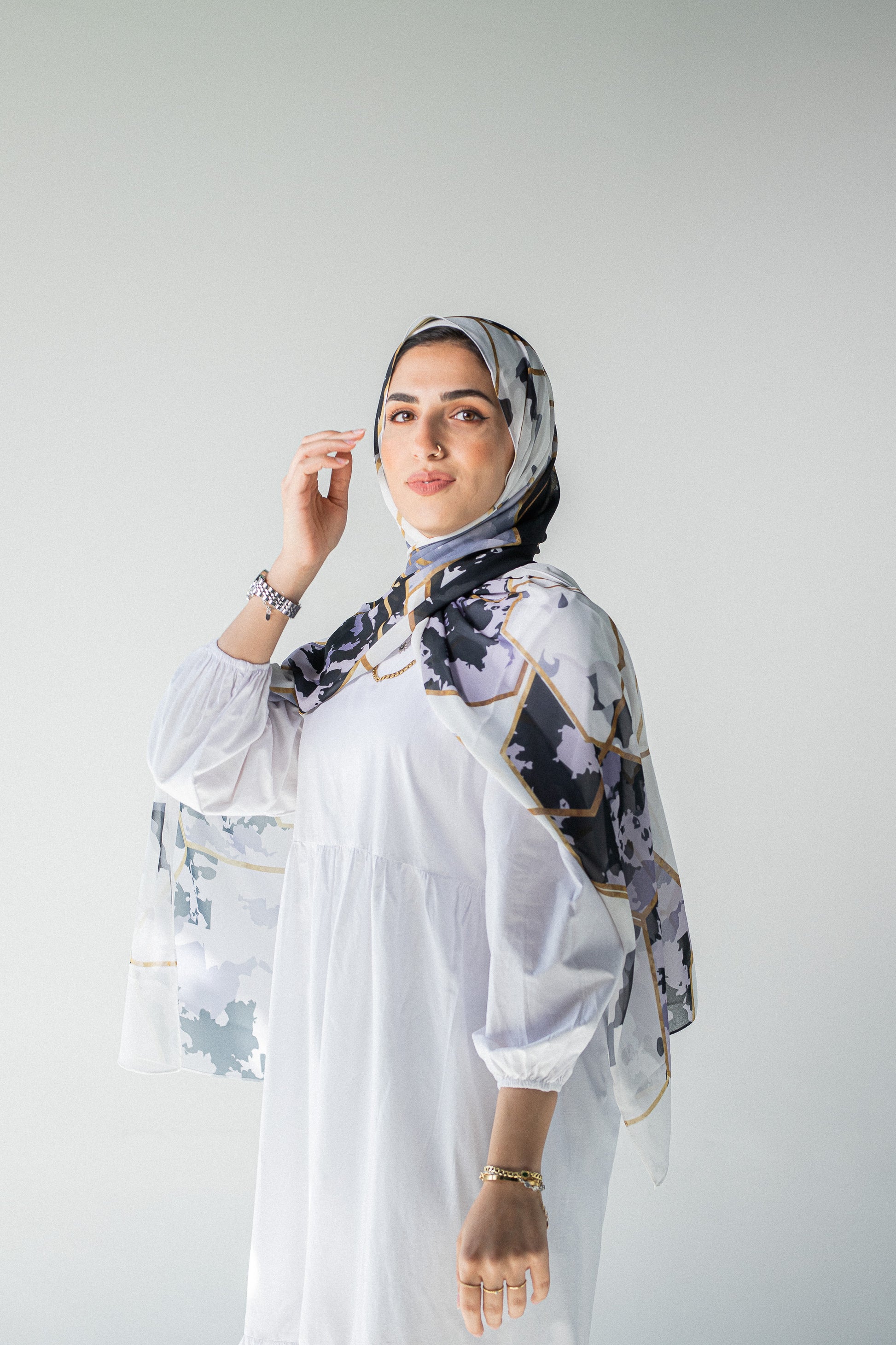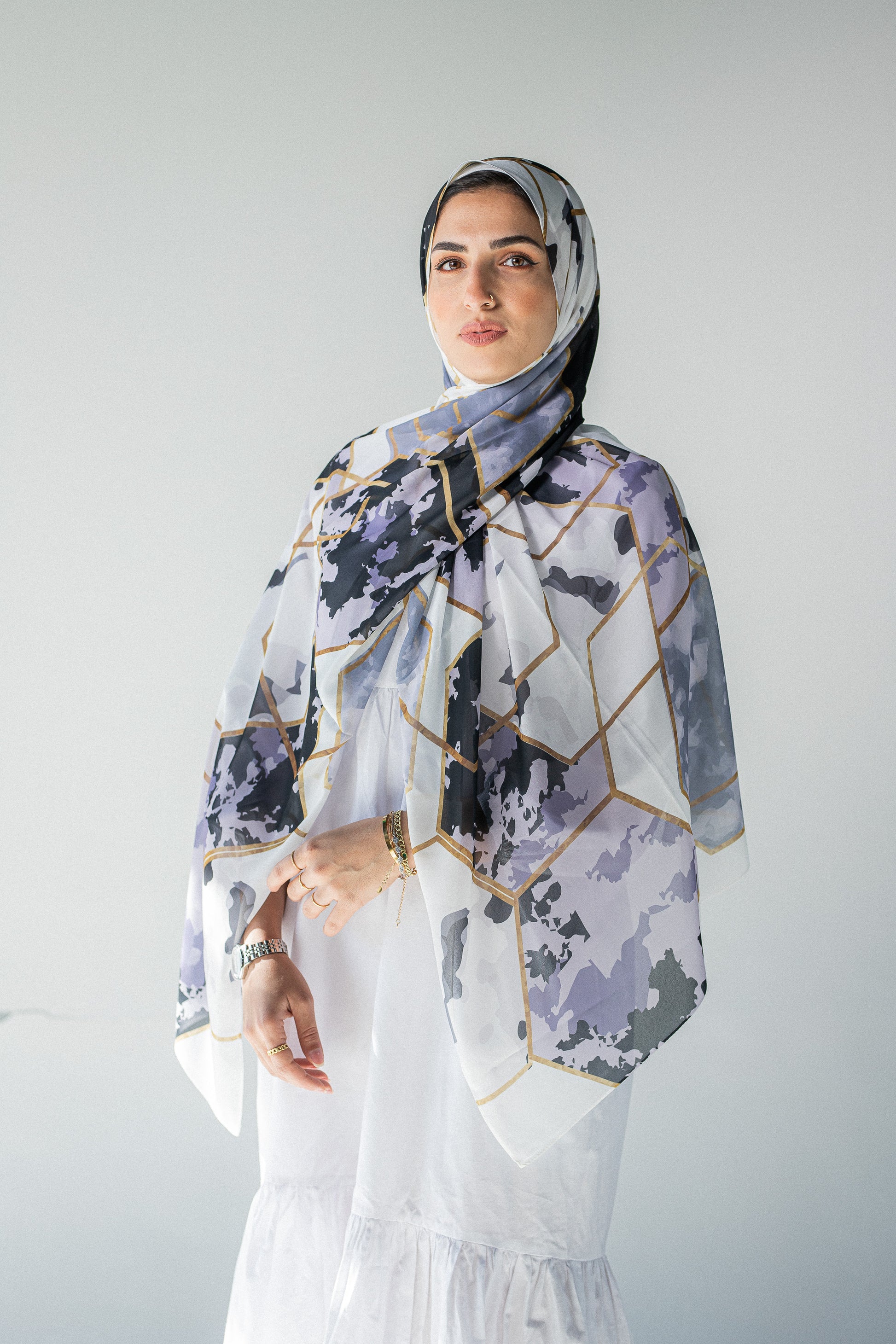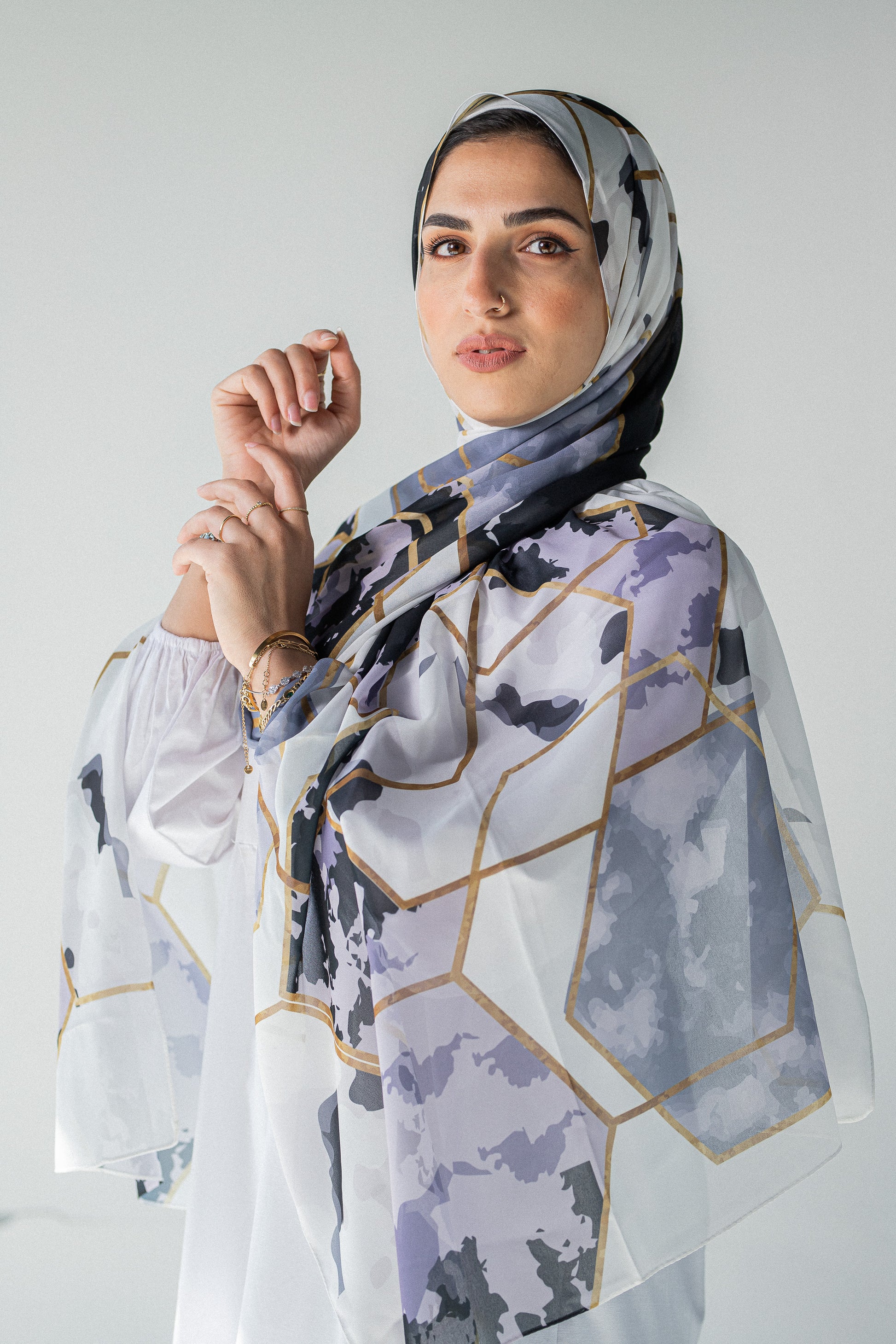 أشكالٌ متشابكةٌ على شكل قرص العسل، بألوانٍ رخاميةٍ سوداء ورمادية وبيضاء، مُؤطَّرةٌ بخطوطٍ ذهبيةٍ فاخرة. تمزج هذه التحفة الهندسية بين الرقيّ العصري ولمسةٍ من الفخامة.