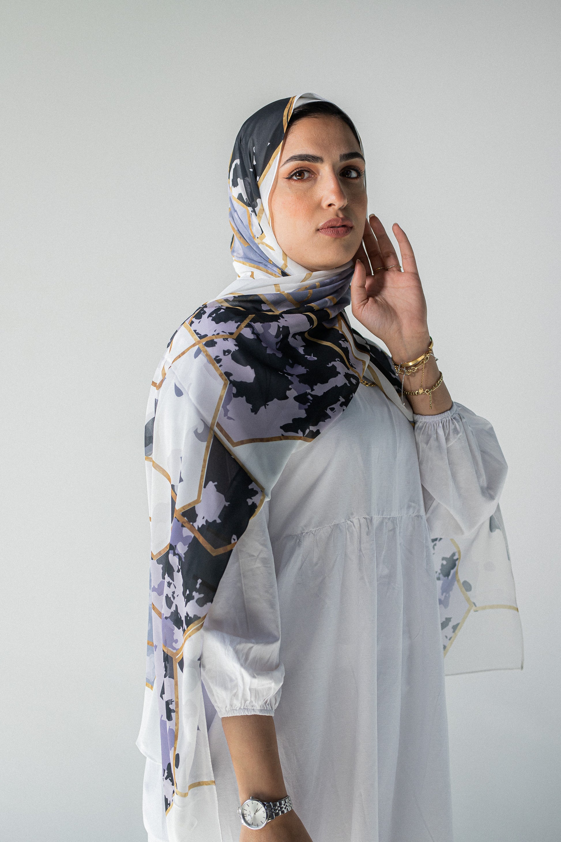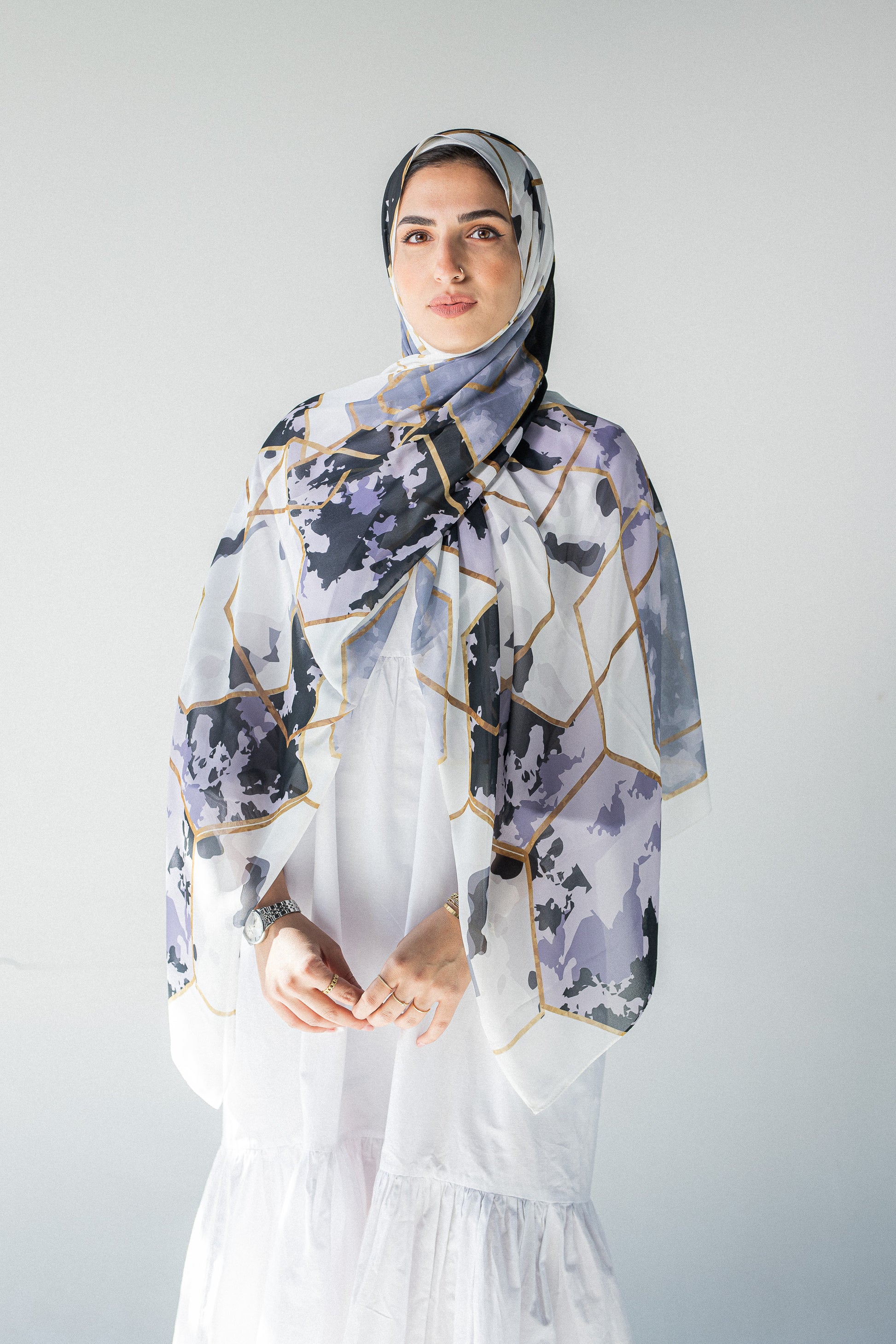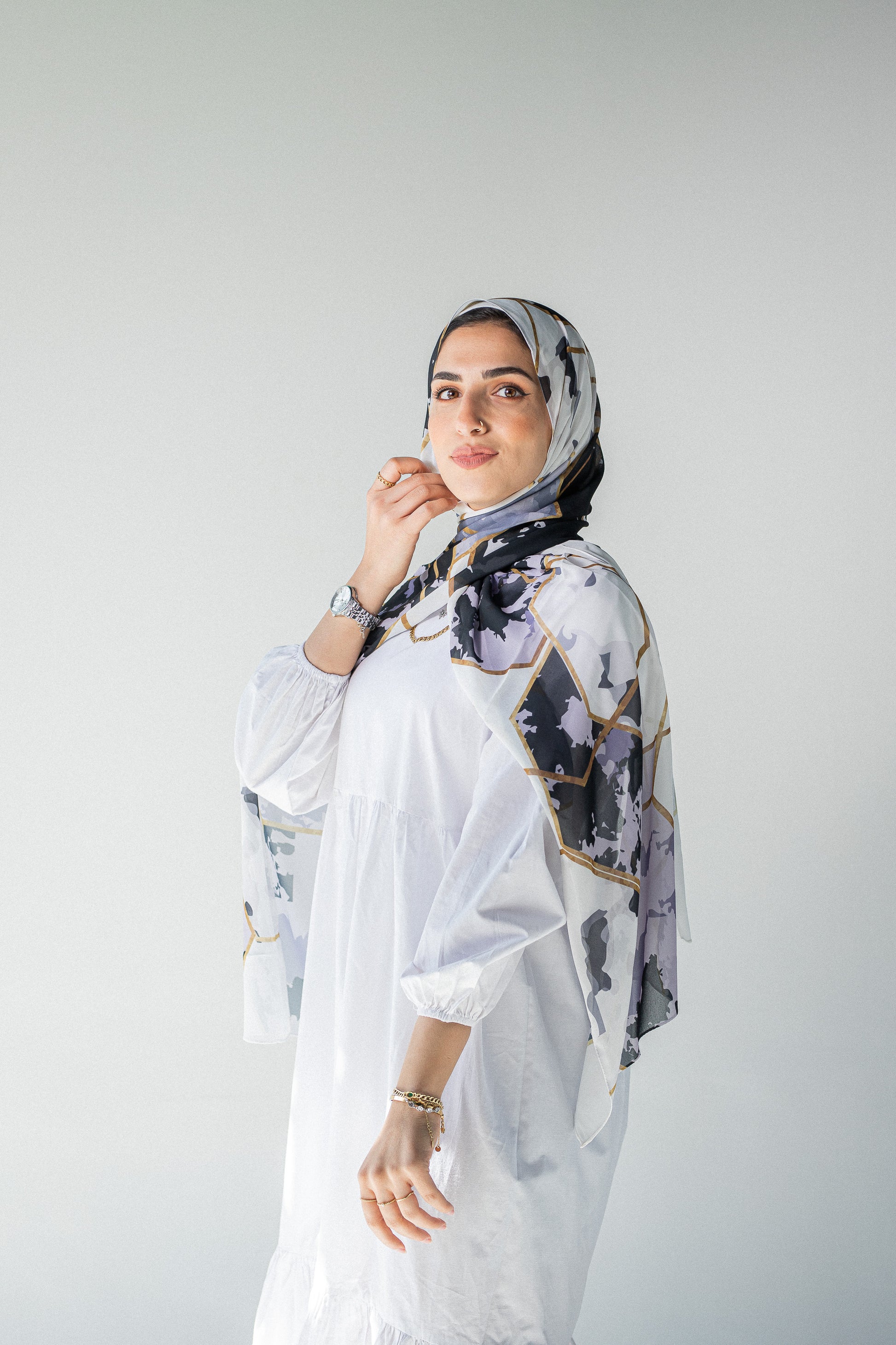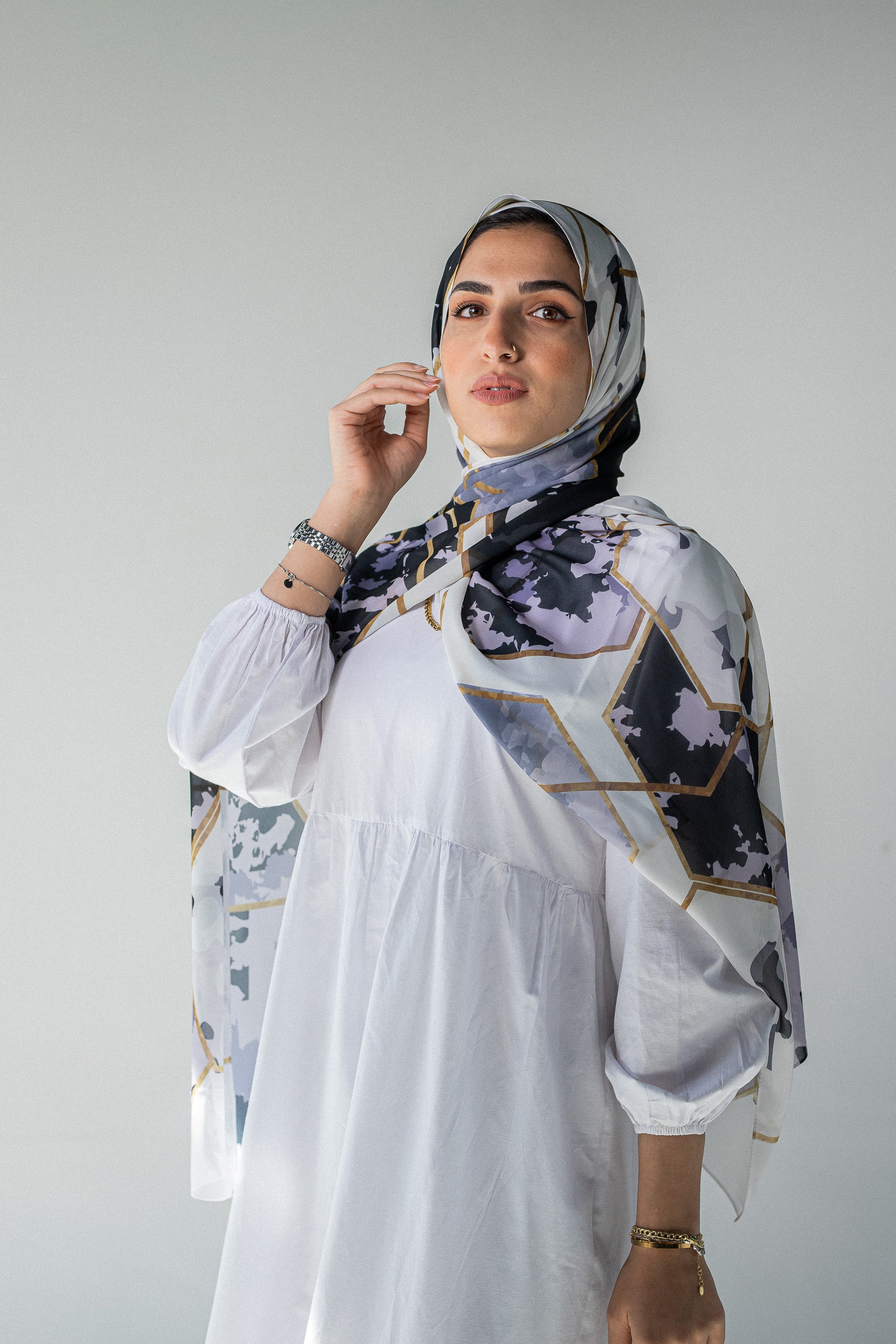 أشكالٌ متشابكةٌ على شكل قرص العسل، بألوانٍ رخاميةٍ سوداء ورمادية وبيضاء، مُؤطَّرةٌ بخطوطٍ ذهبيةٍ فاخرة. تمزج هذه التحفة الهندسية بين الرقيّ العصري ولمسةٍ من الفخامة.