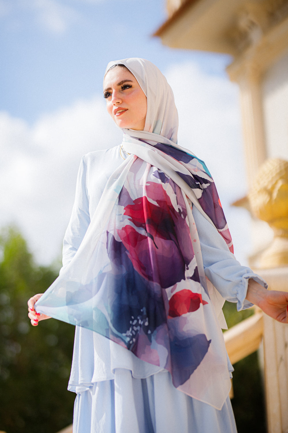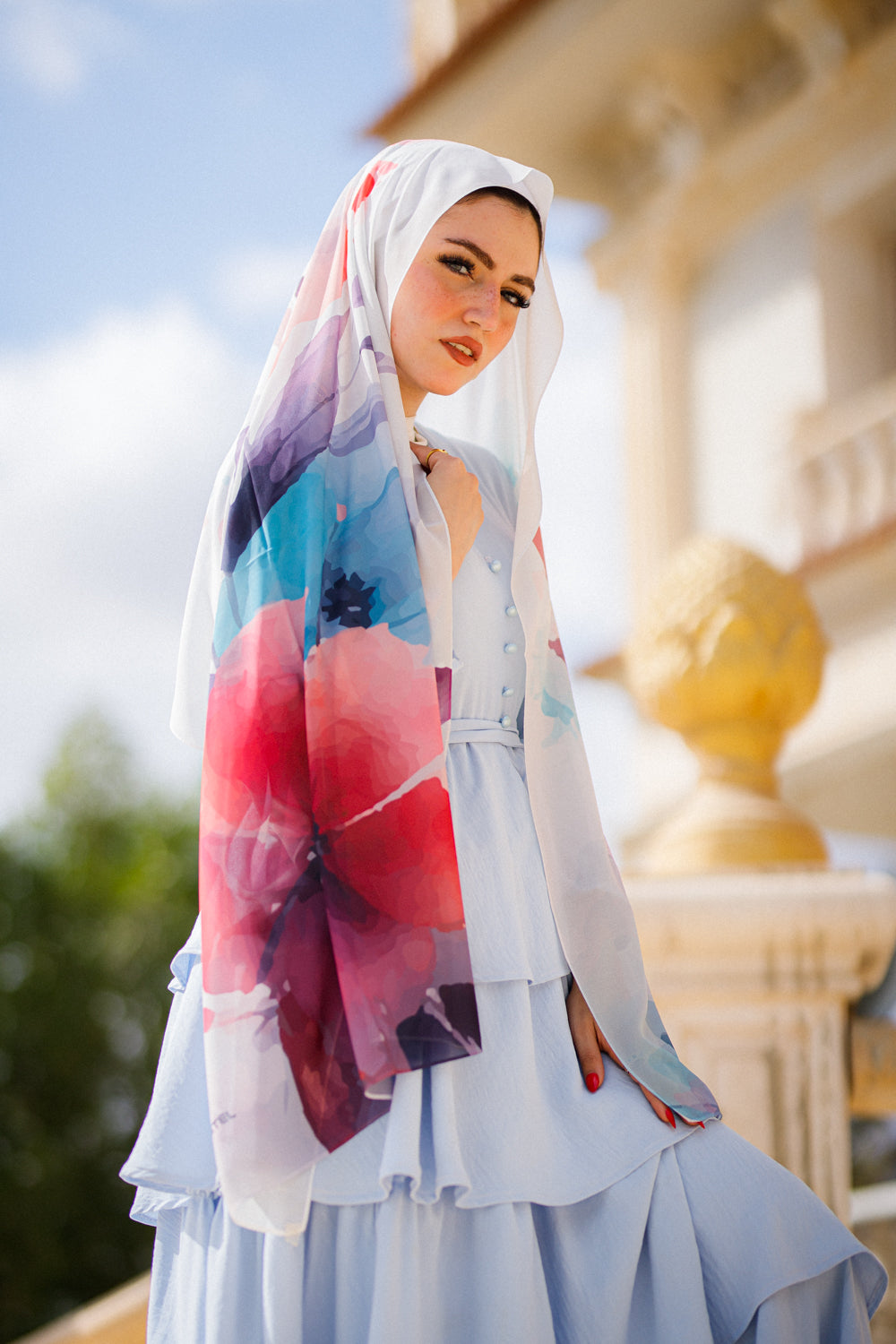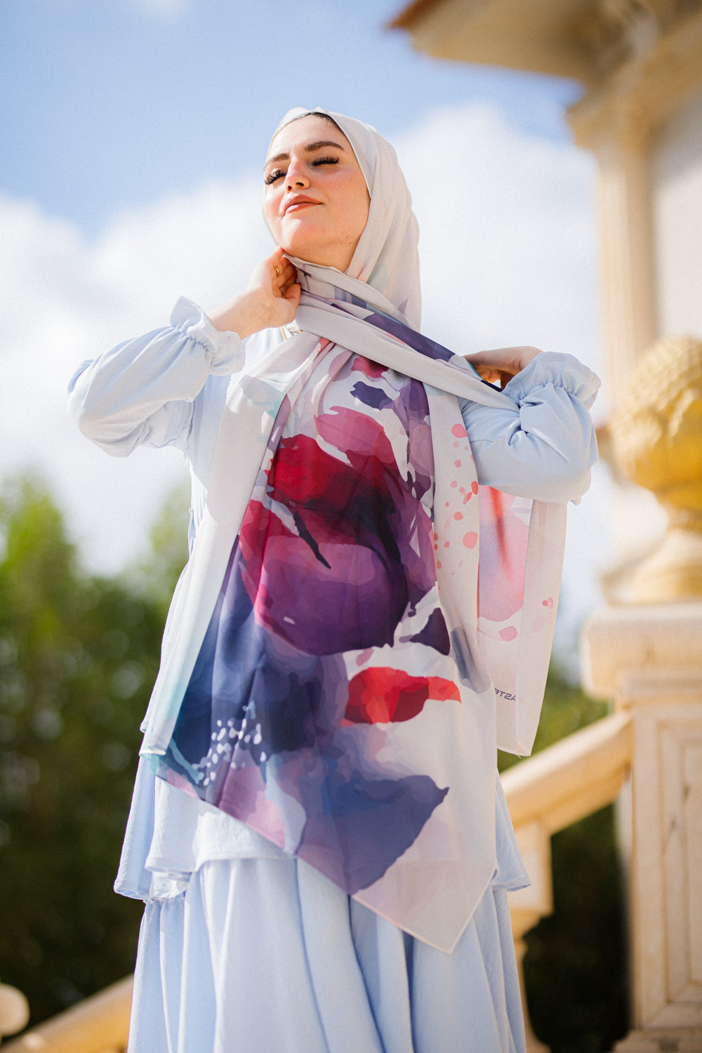 زهور مائية جريئة بألوان عنابي وأزرق مخضر ومرجاني، تمتد عموديًا على خلفية بيضاء. يُحقق هذا التصميم الفني توازنًا مثاليًا بين الأناقة النابضة بالحياة والرقيّ الأنيق.