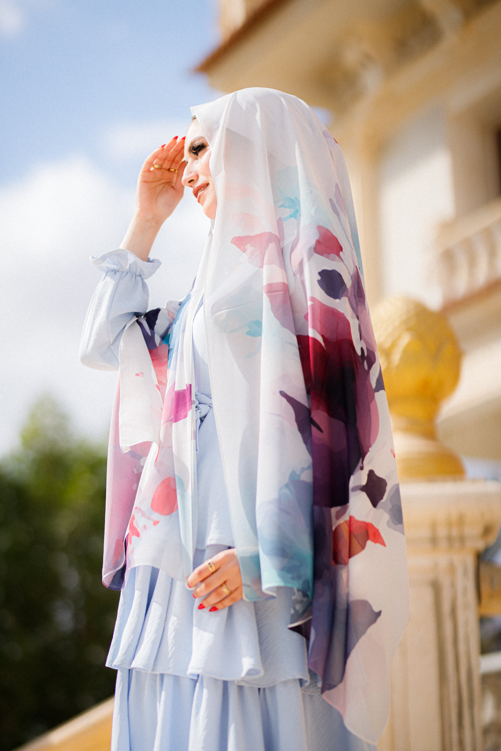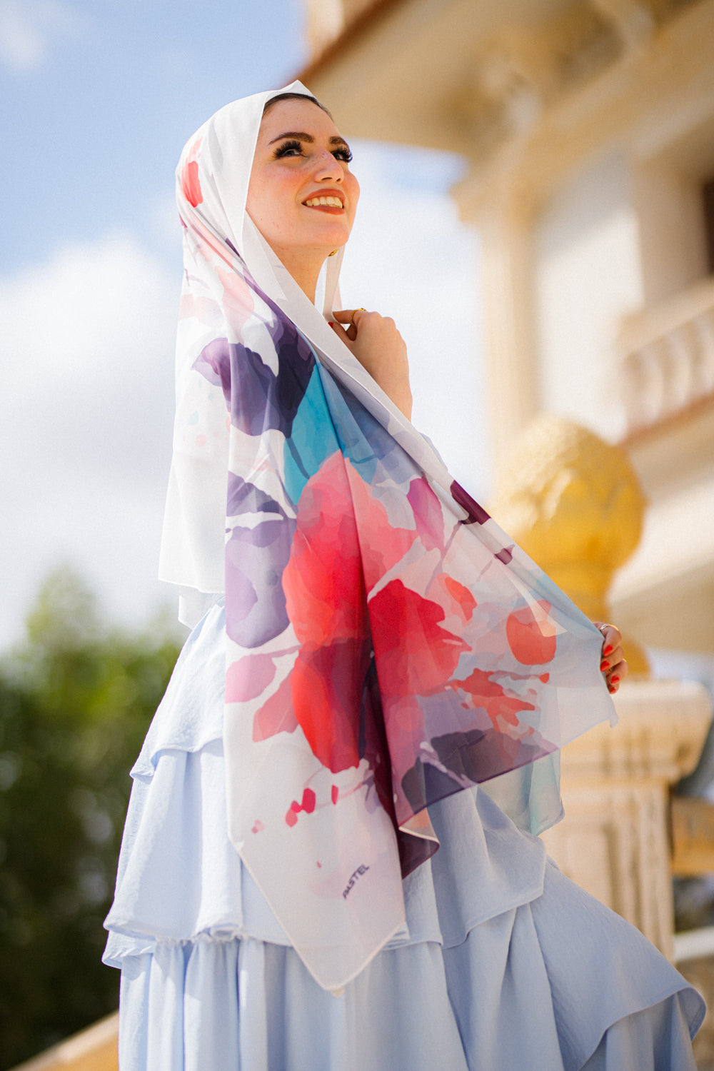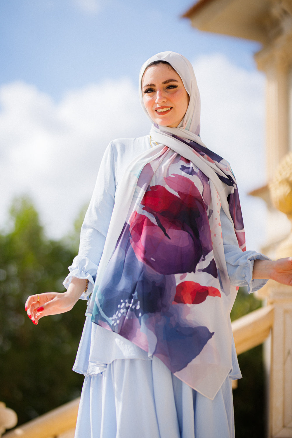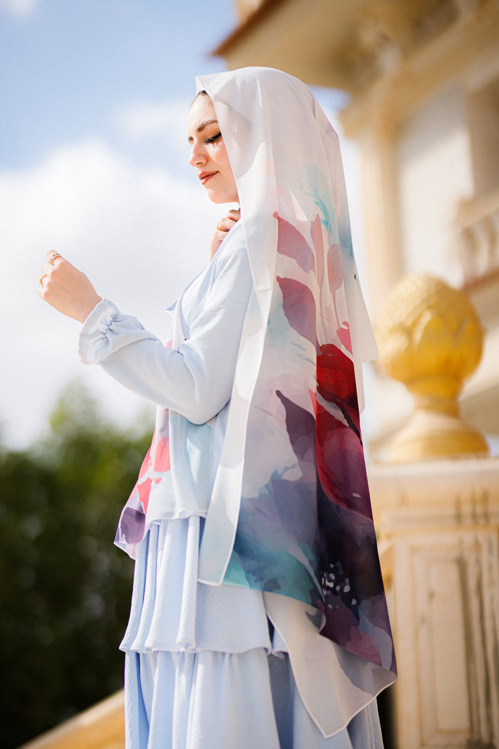 زهور مائية جريئة بألوان عنابي وأزرق مخضر ومرجاني، تمتد عموديًا على خلفية بيضاء. يُحقق هذا التصميم الفني توازنًا مثاليًا بين الأناقة النابضة بالحياة والرقيّ الأنيق.