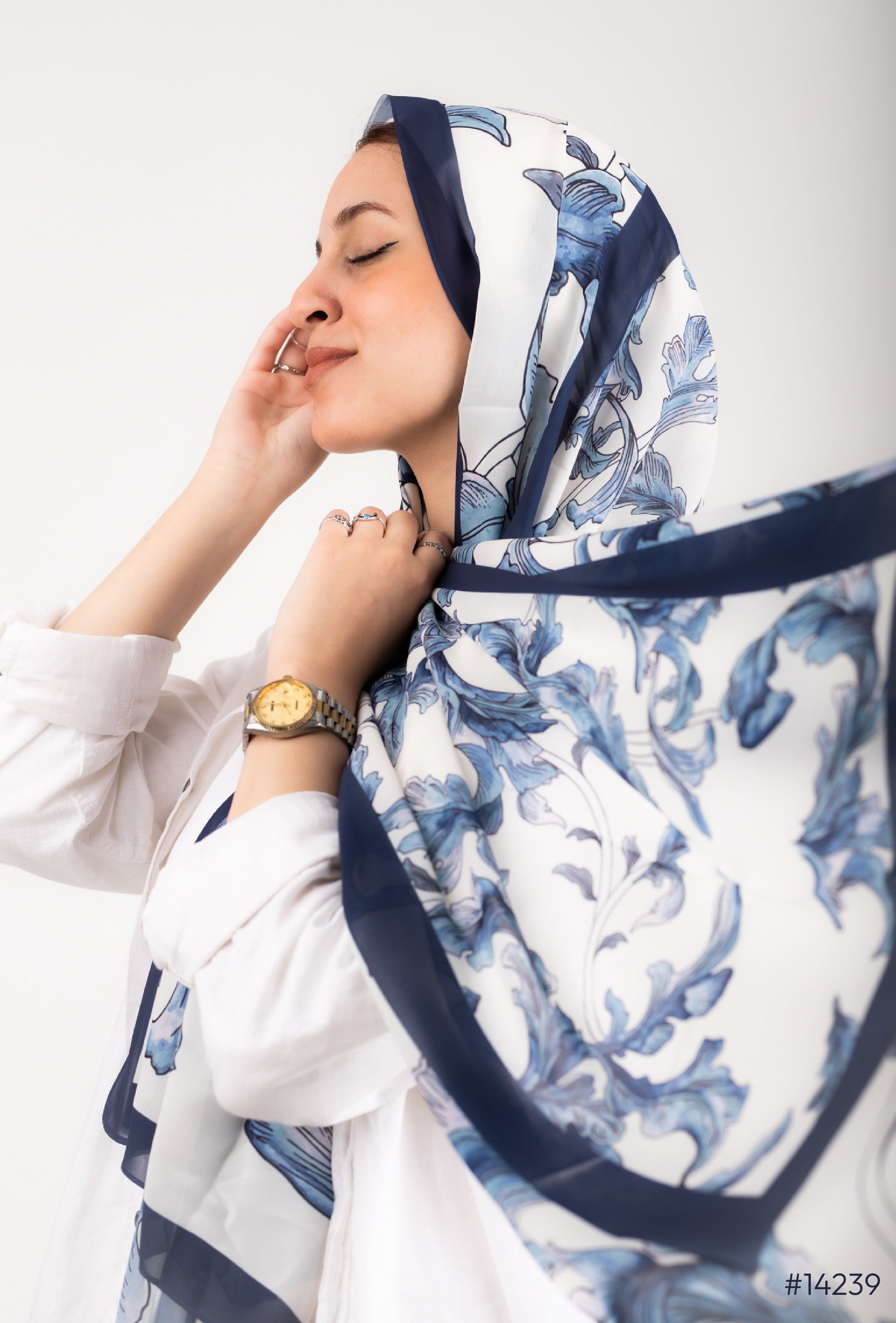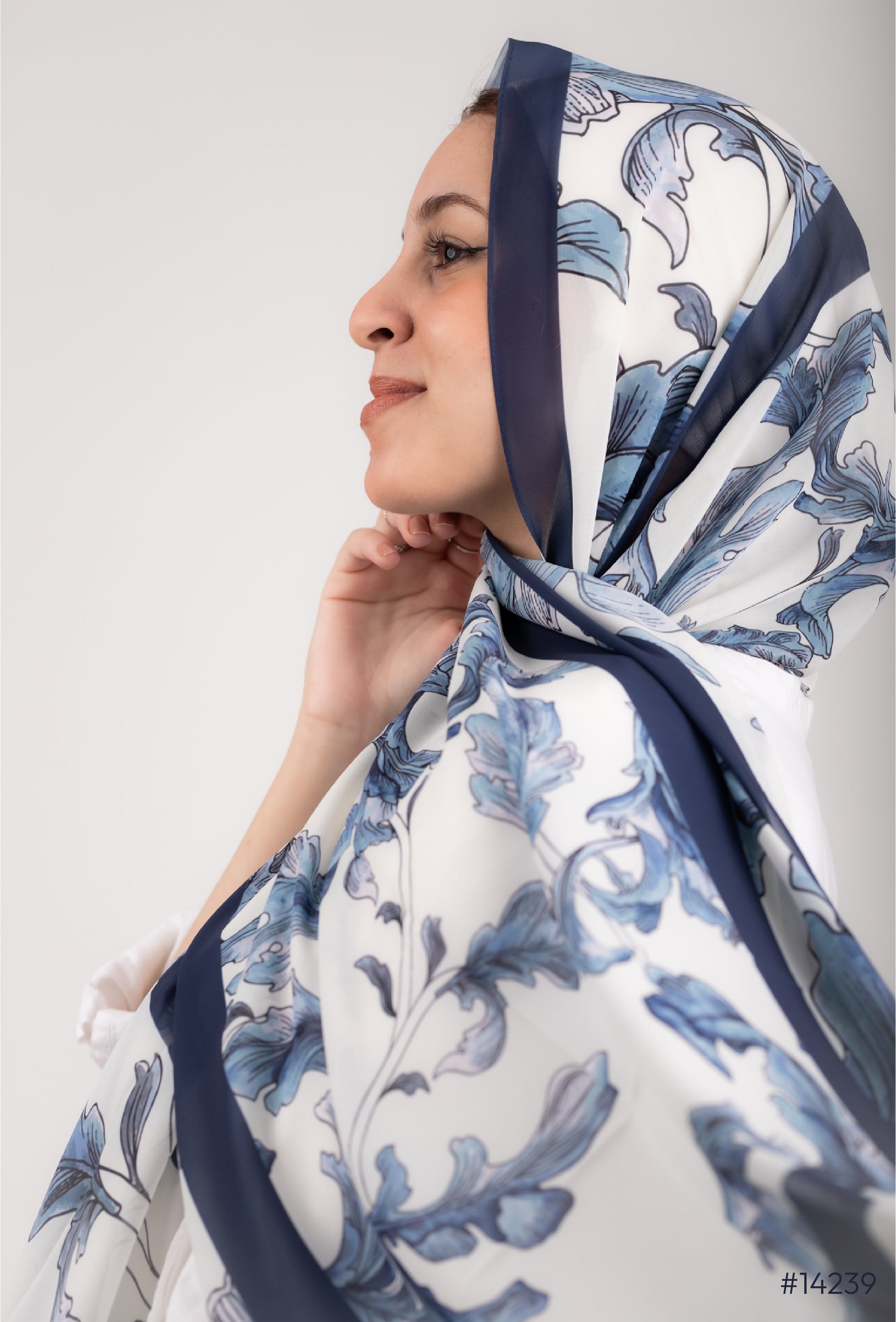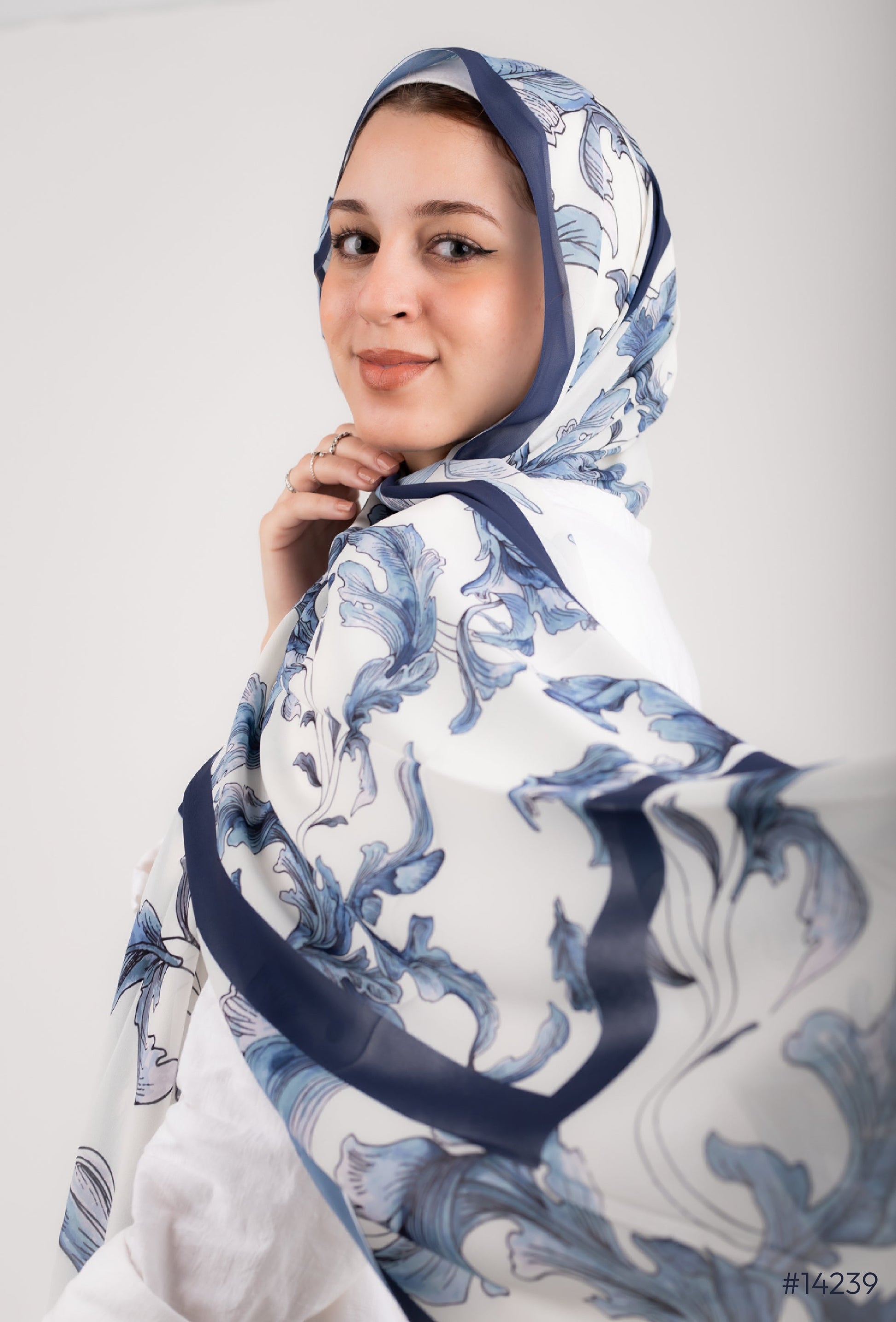 The "Midnight Elegance" scarf is a stunning work of art; showcasing an exquisite floral motif that exudes refined sophistication. Crafted with the finest materials; this generous wrap features a mesmerizing pattern of intricate; flowing designs in a captivating palette of blues; grays; and soft; creamy accents.