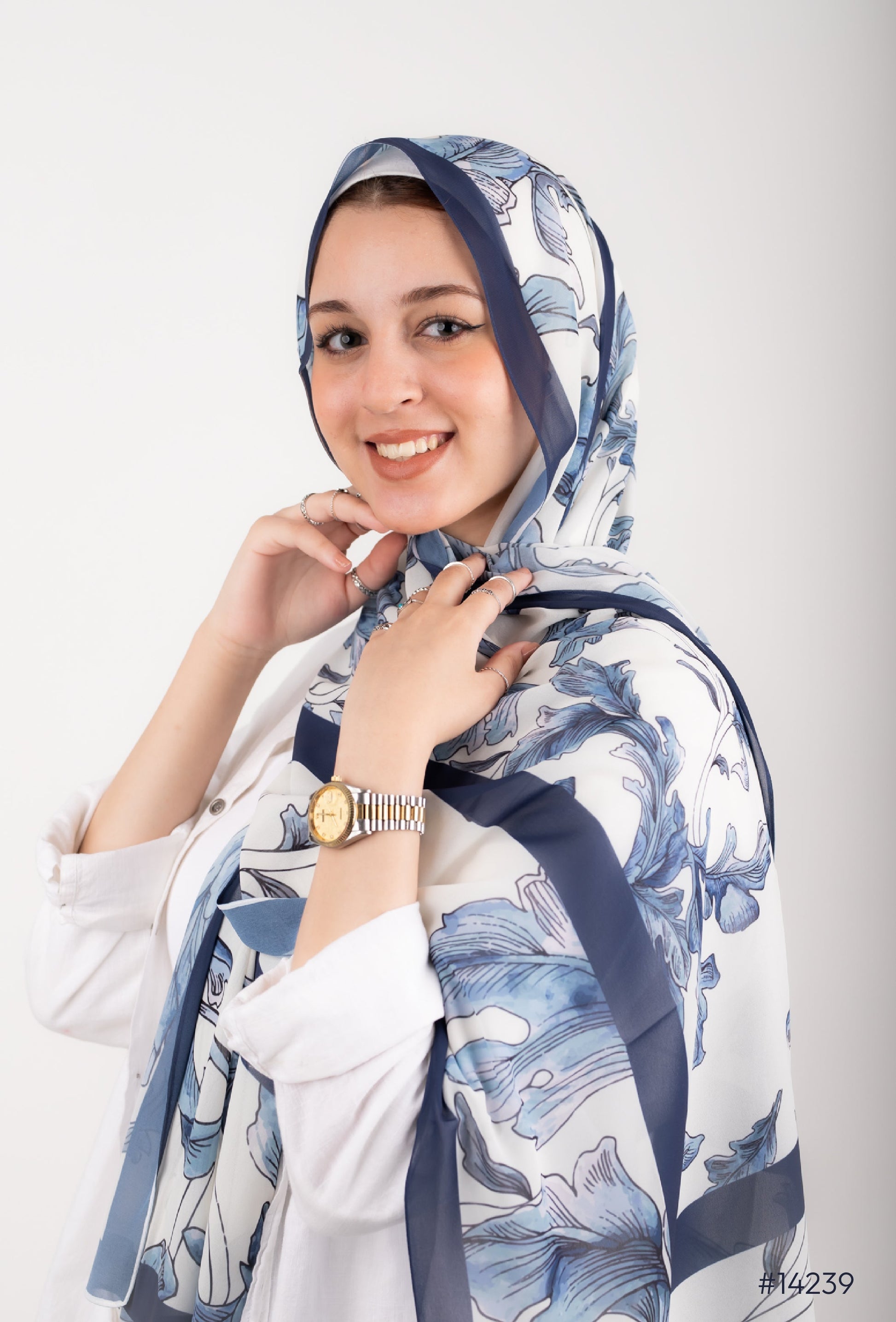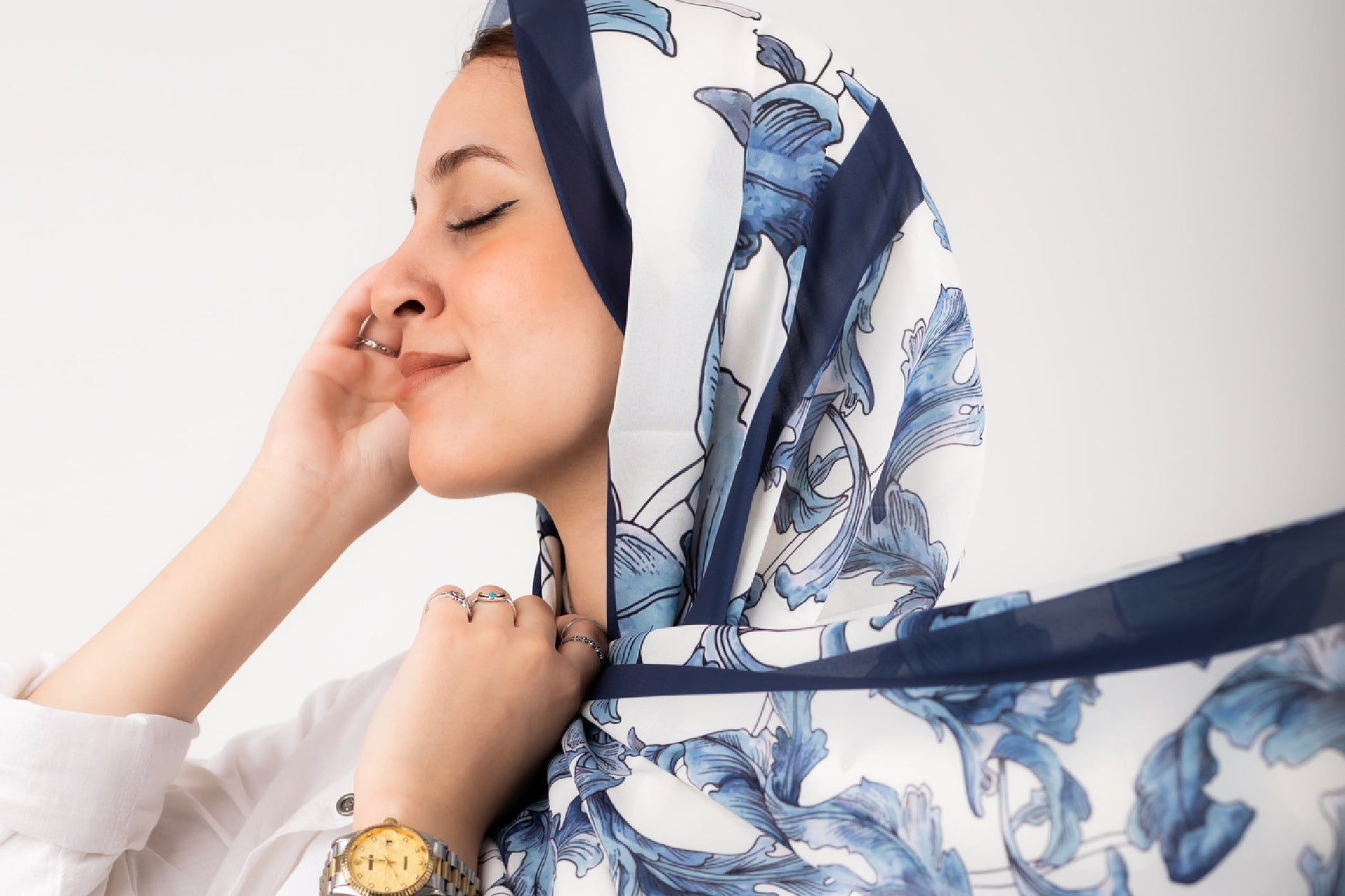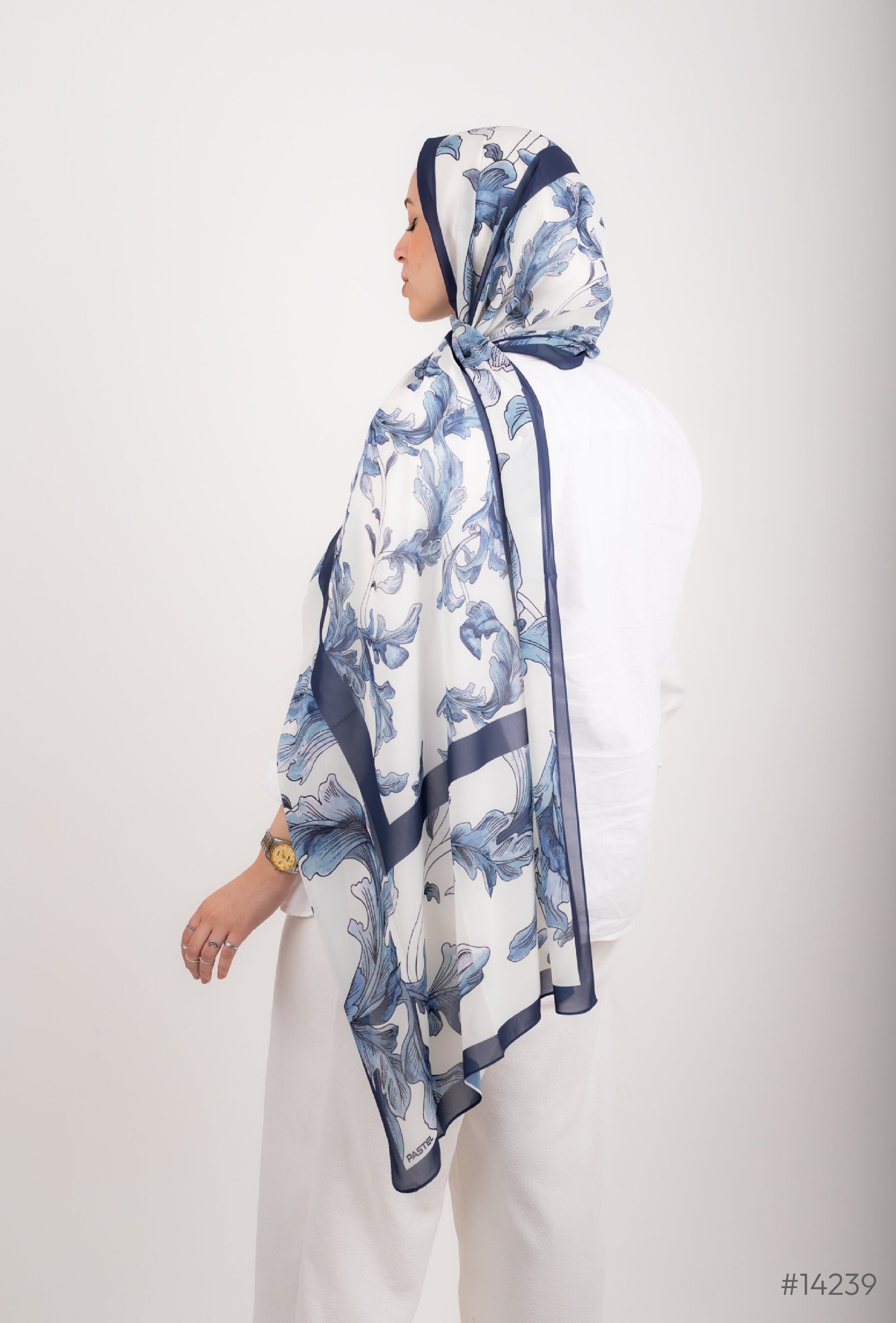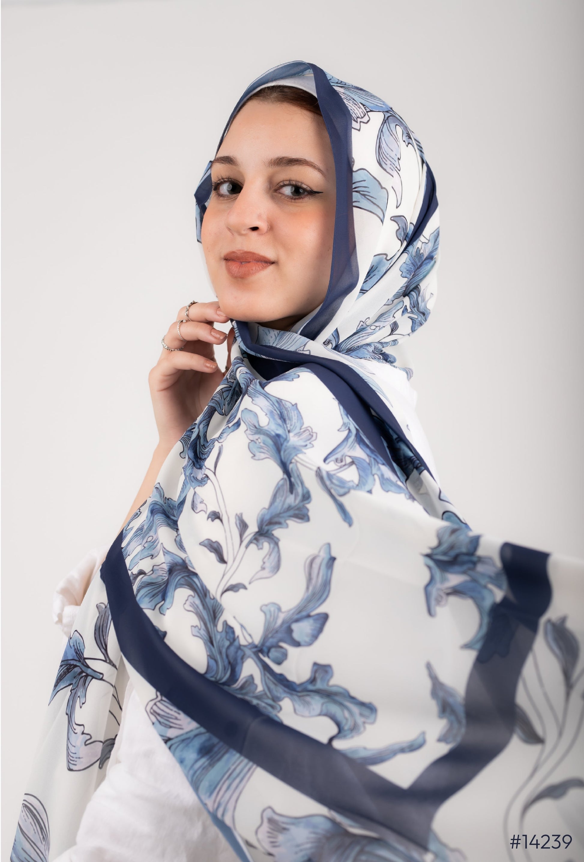 The "Midnight Elegance" scarf is a stunning work of art; showcasing an exquisite floral motif that exudes refined sophistication. Crafted with the finest materials; this generous wrap features a mesmerizing pattern of intricate; flowing designs in a captivating palette of blues; grays; and soft; creamy accents.