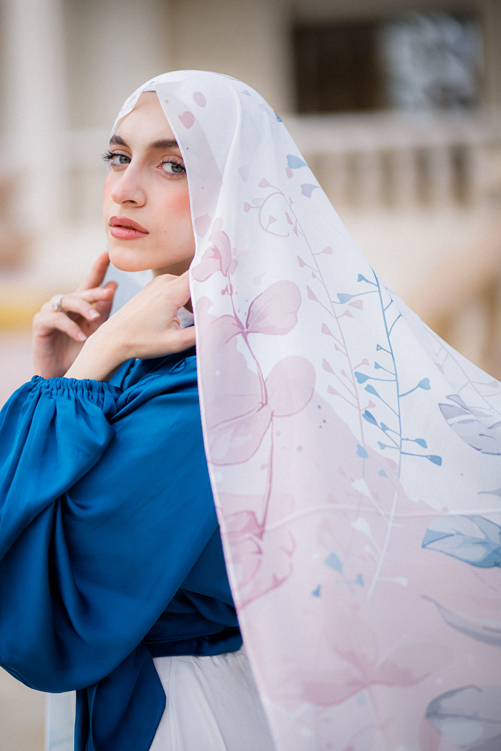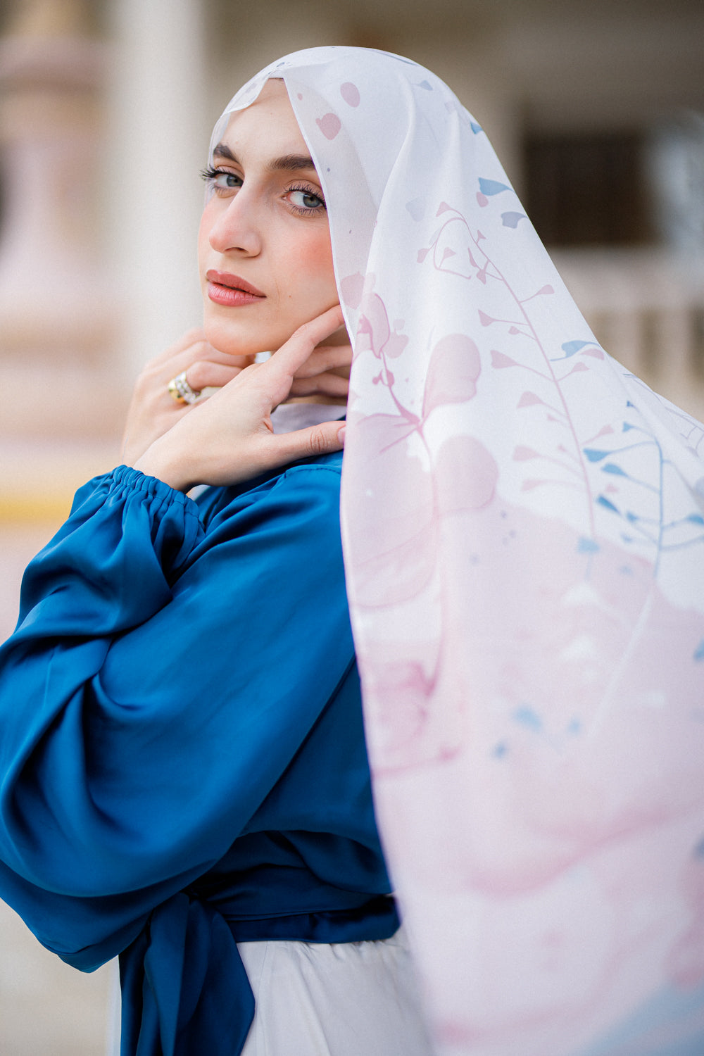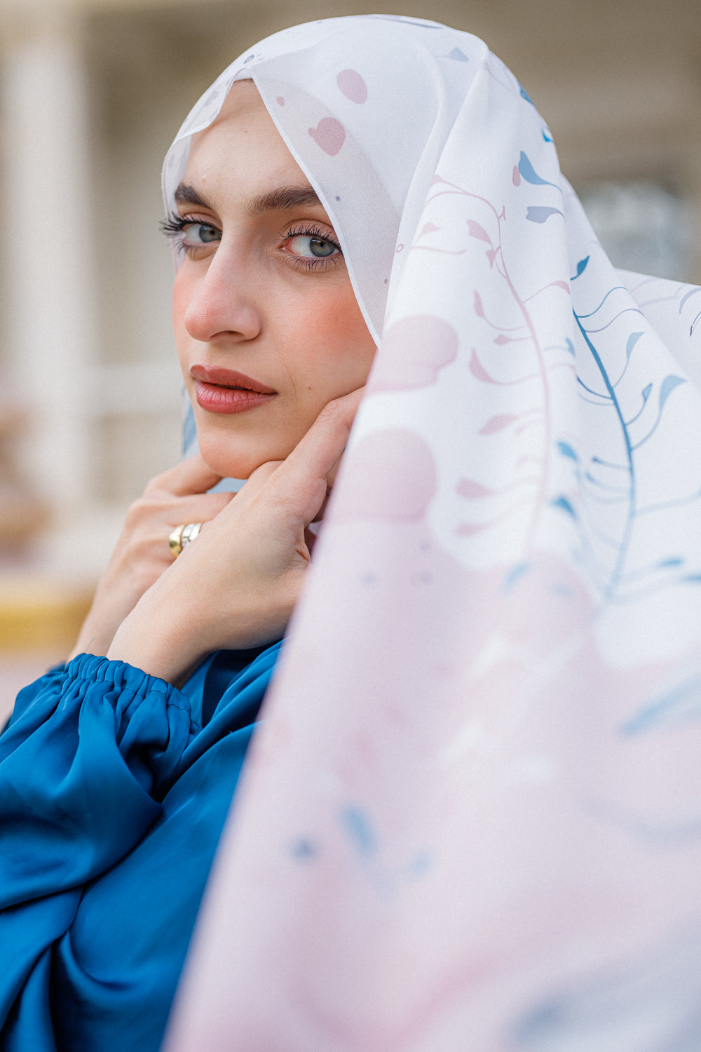 أوراق النعناع الناعمة وأوراق الخدود الوردية تتشابك برشاقة على مركز أبيض ناصع. هذا التصميم الرقيق ينضح بسحر رقيق ورومانسي، مثالي لمن يبحث عن إكسسوار هادئ وراقي.