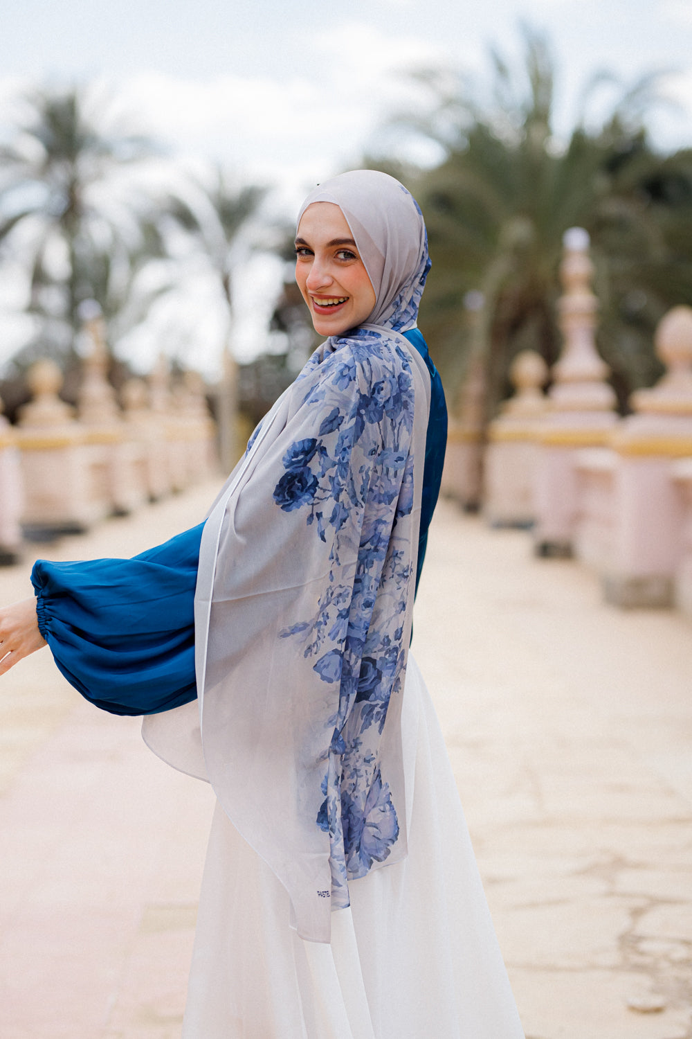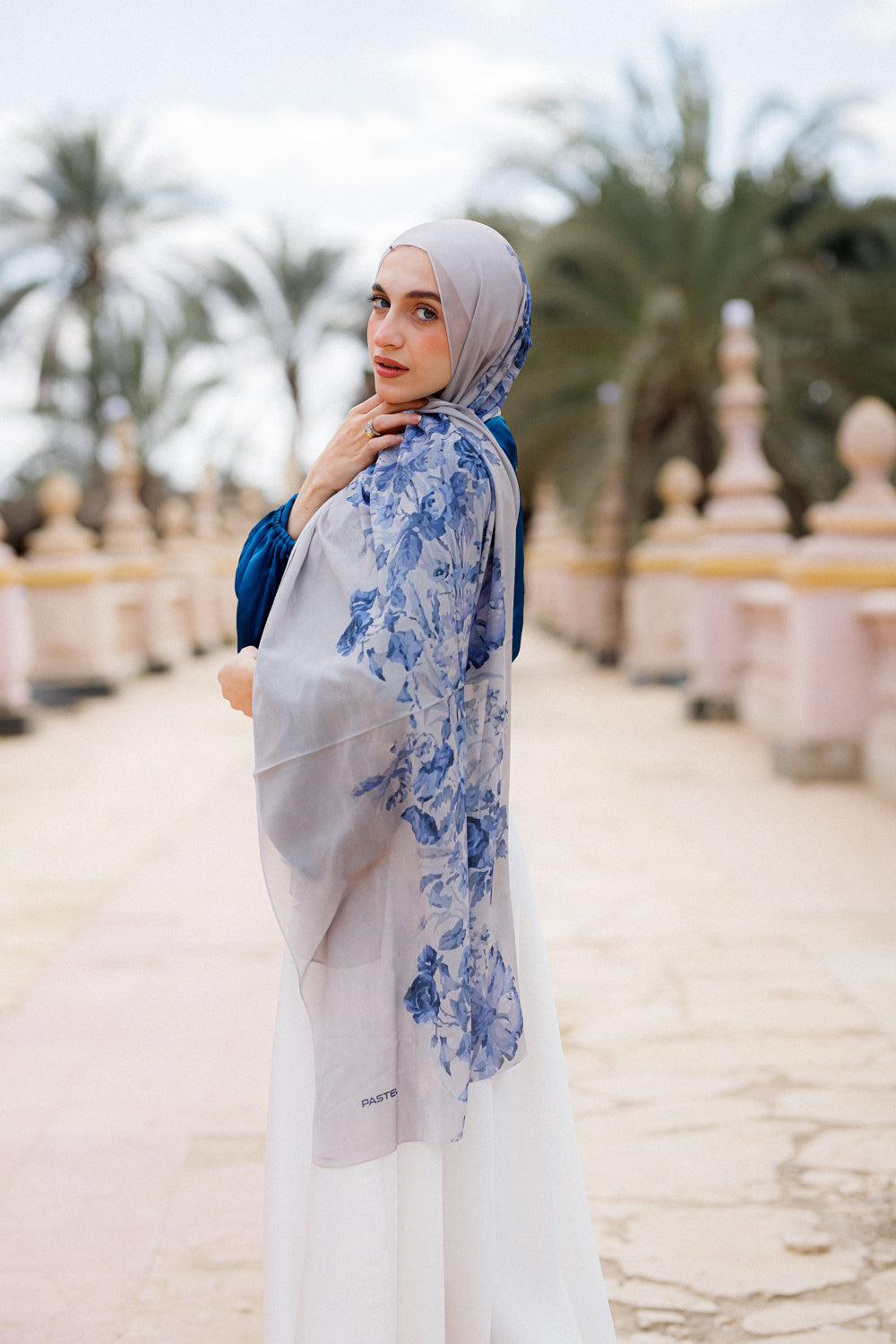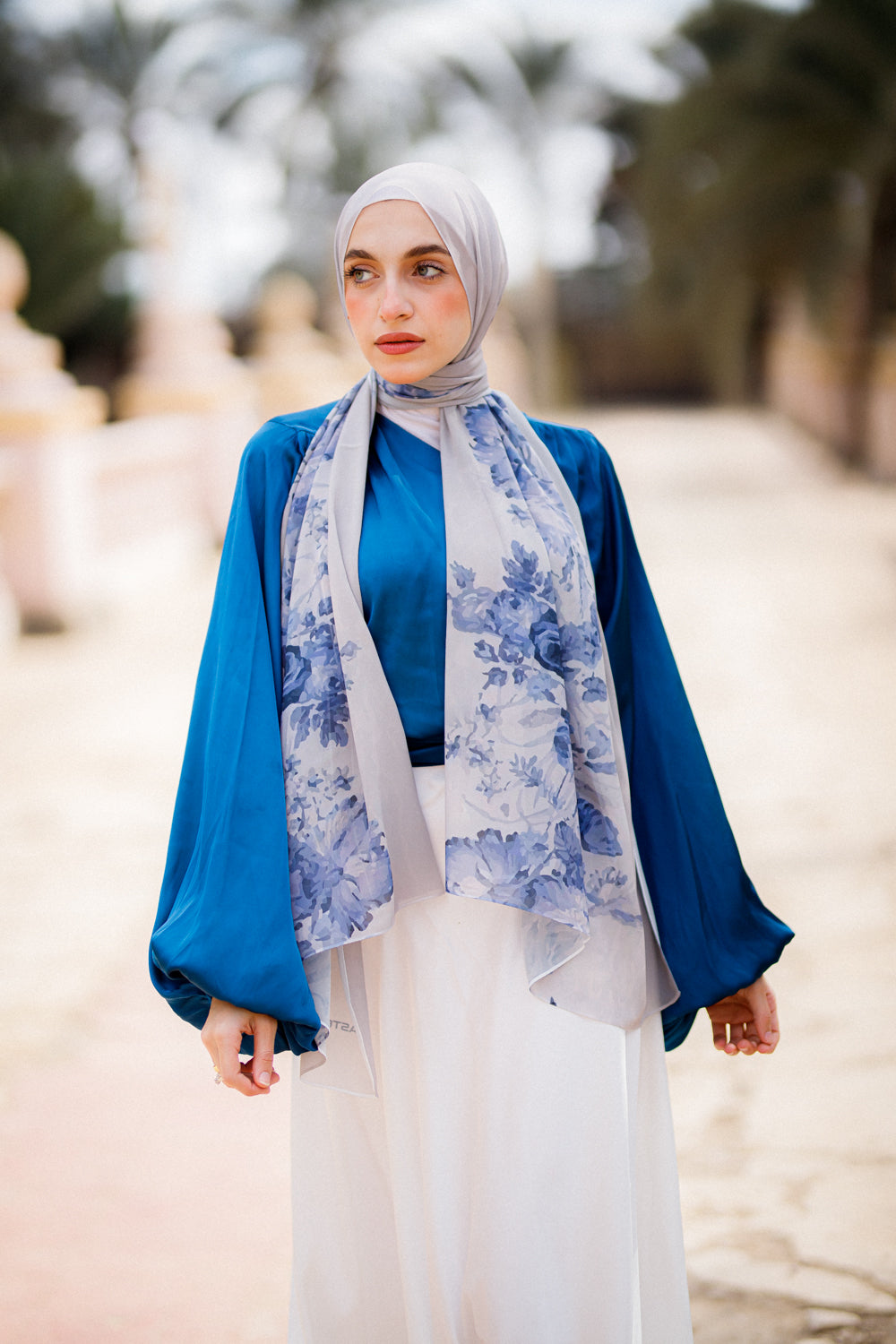 عمودٌ أنيق من الأزهار ذات الظلال الناعمة بدرجات الأزرق الباهتة، ينساب على خلفية بيج ناعمة، ينضح بسكينة راقية. يضفي هذا التصميم الرقيق أناقةً راقية على أي إطلالة، مثاليًا للارتداء اليومي والمناسبات الخاصة.