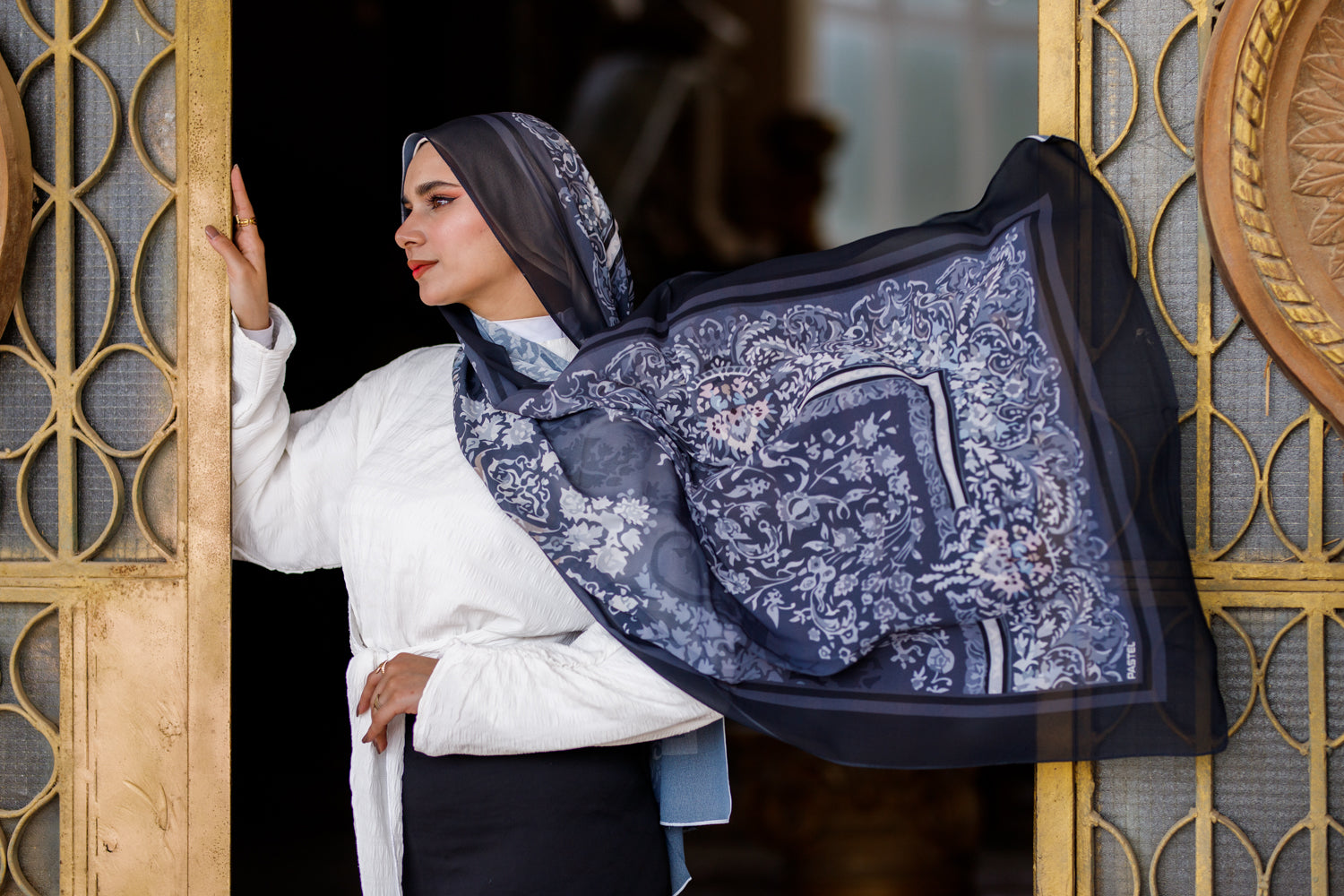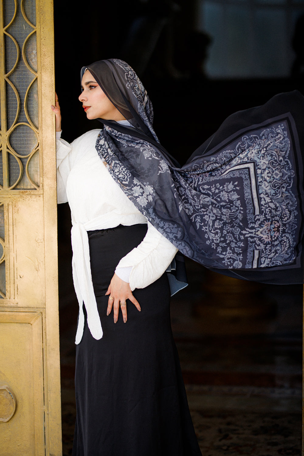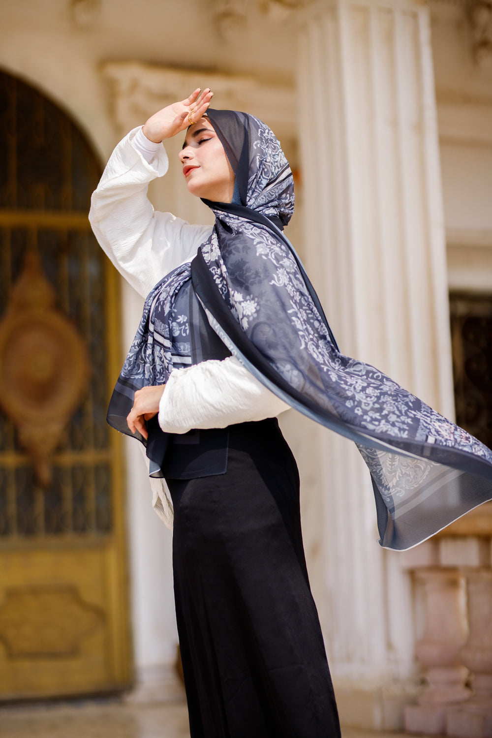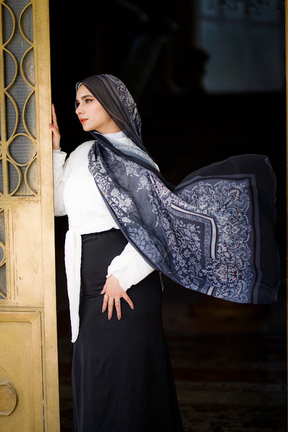 تفاصيل عربية متقنة بدرجات رمادية وفضية دخانية تُذكّر بفخامة القصور الشرقية. بزخارفها الراقية، تُضفي لمسةً فخمةً على الإطلالات الكلاسيكية والمعاصرة.