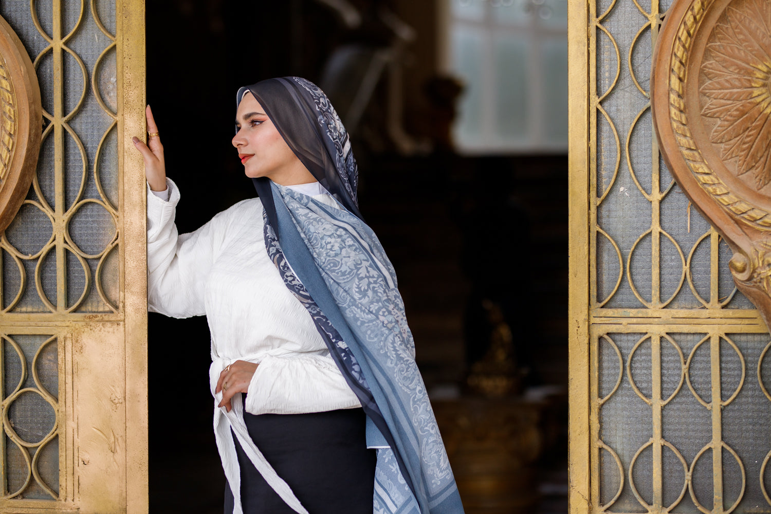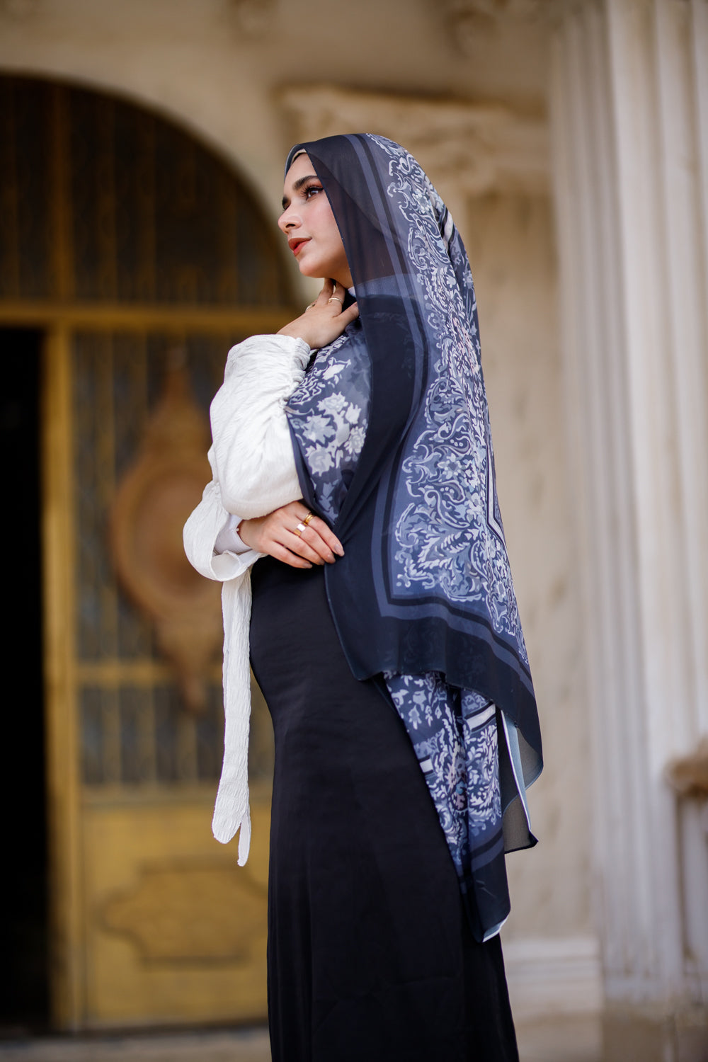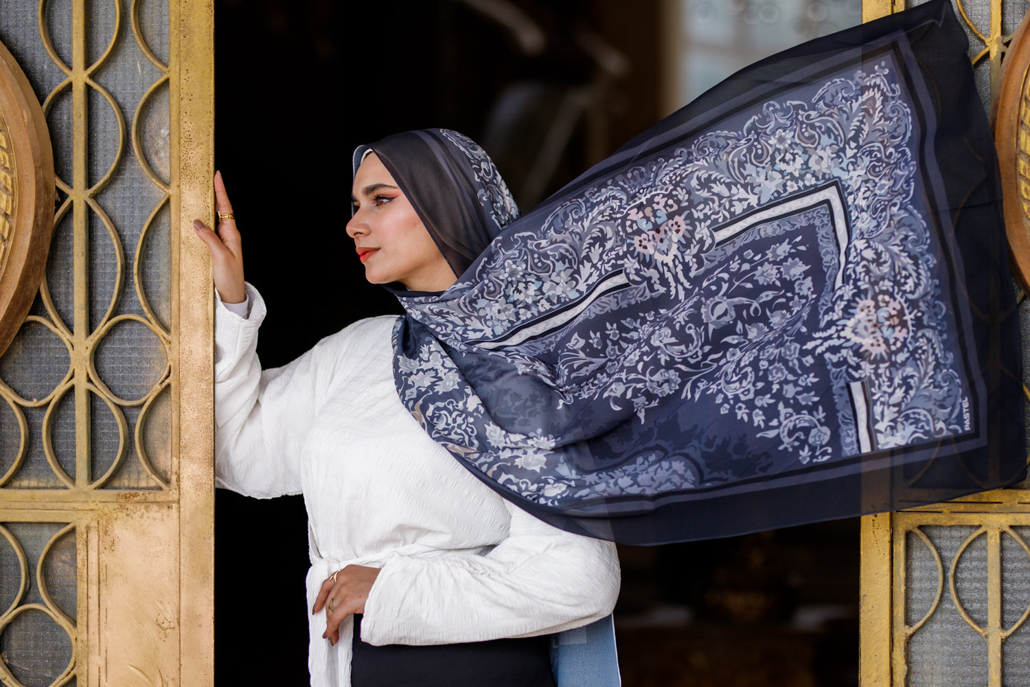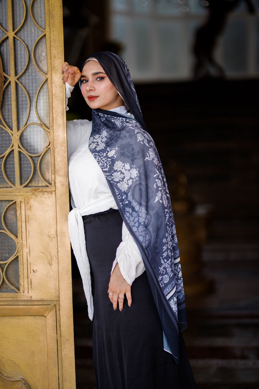 تفاصيل عربية متقنة بدرجات رمادية وفضية دخانية تُذكّر بفخامة القصور الشرقية. بزخارفها الراقية، تُضفي لمسةً فخمةً على الإطلالات الكلاسيكية والمعاصرة.