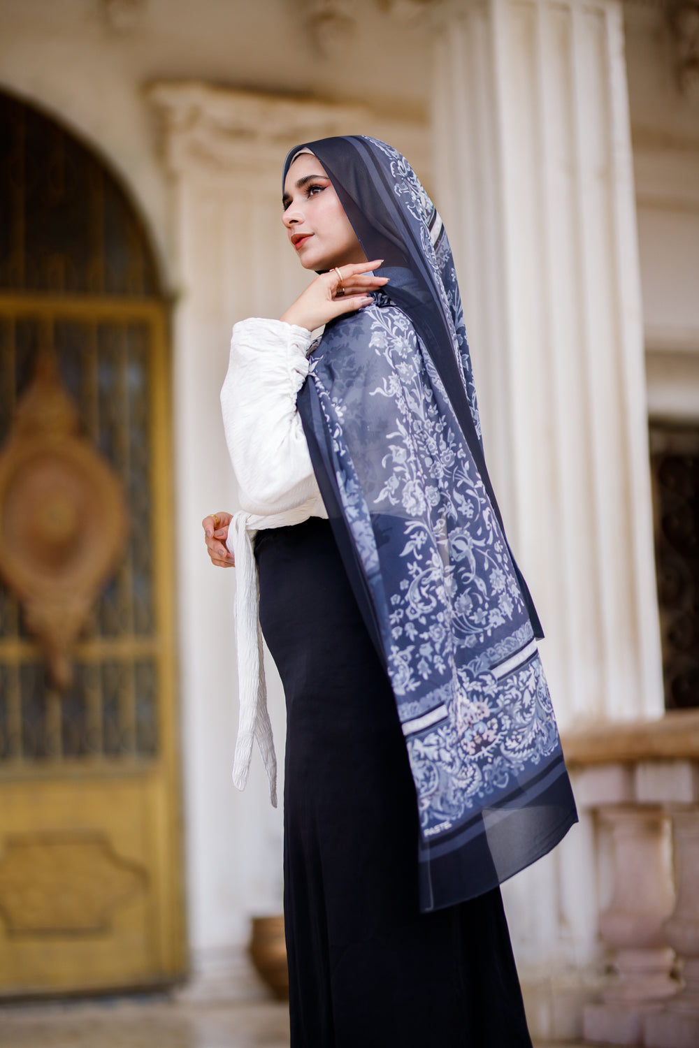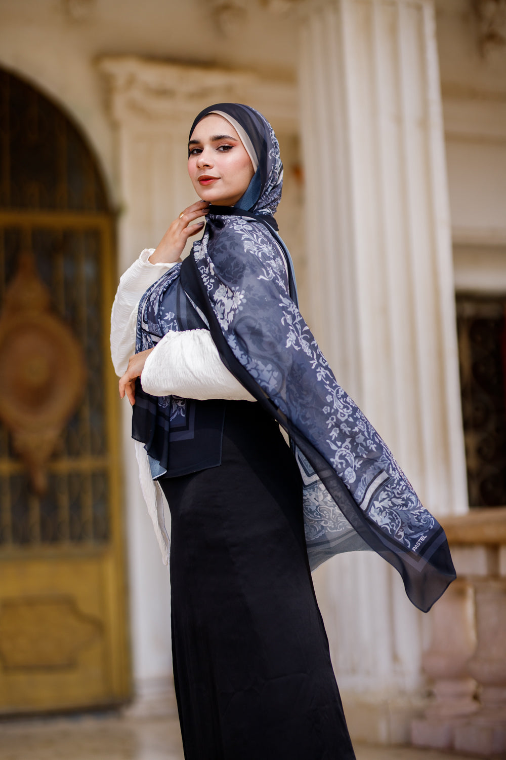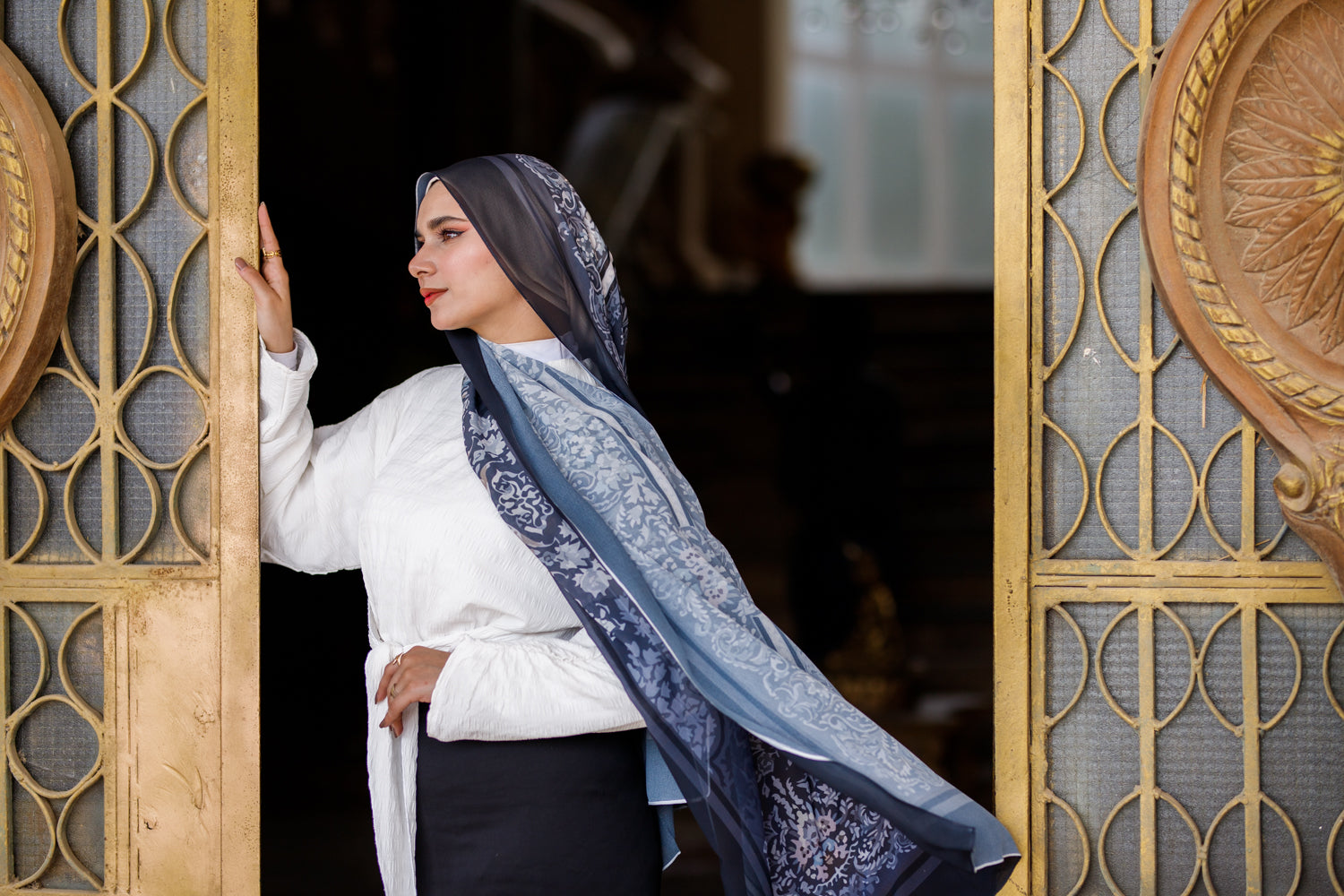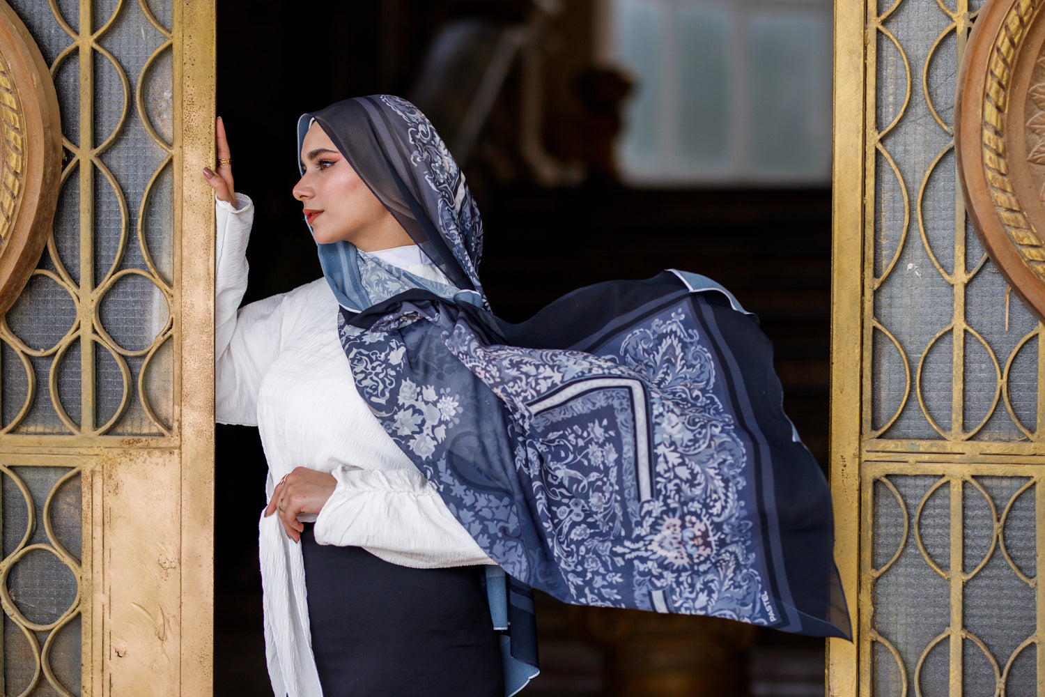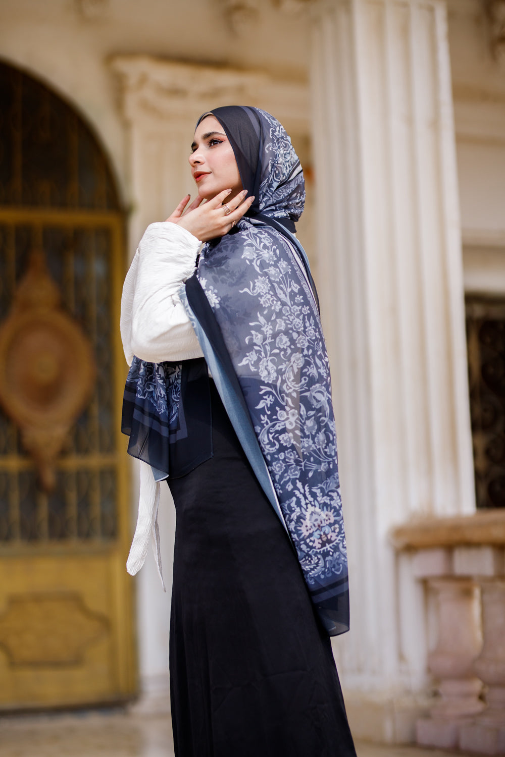 تفاصيل عربية متقنة بدرجات رمادية وفضية دخانية تُذكّر بفخامة القصور الشرقية. بزخارفها الراقية، تُضفي لمسةً فخمةً على الإطلالات الكلاسيكية والمعاصرة.