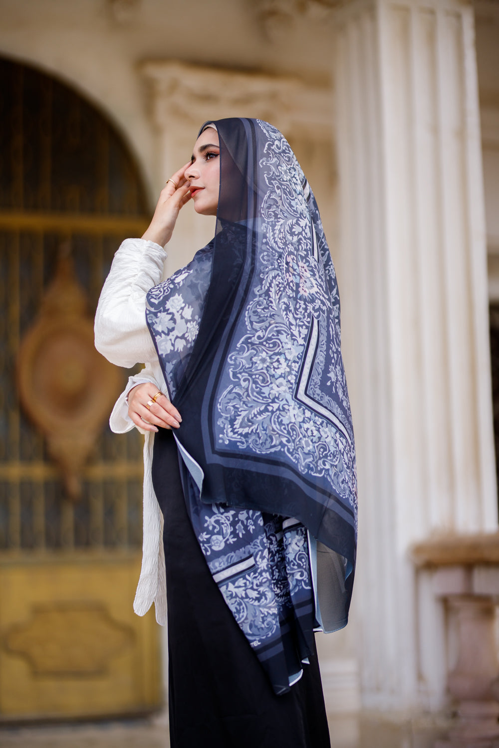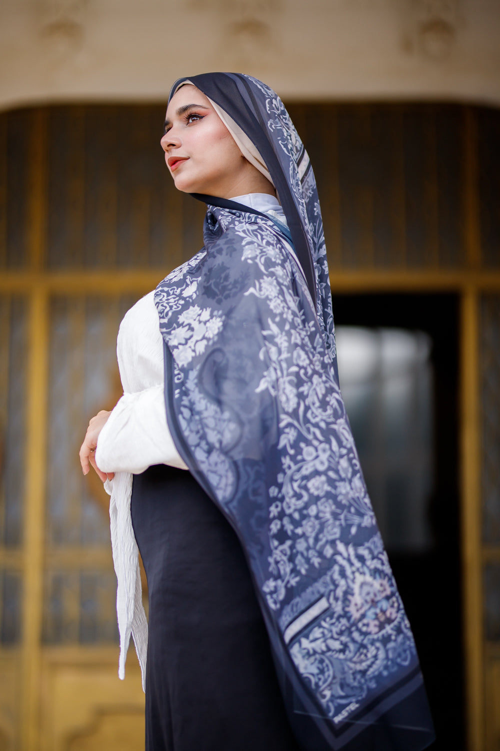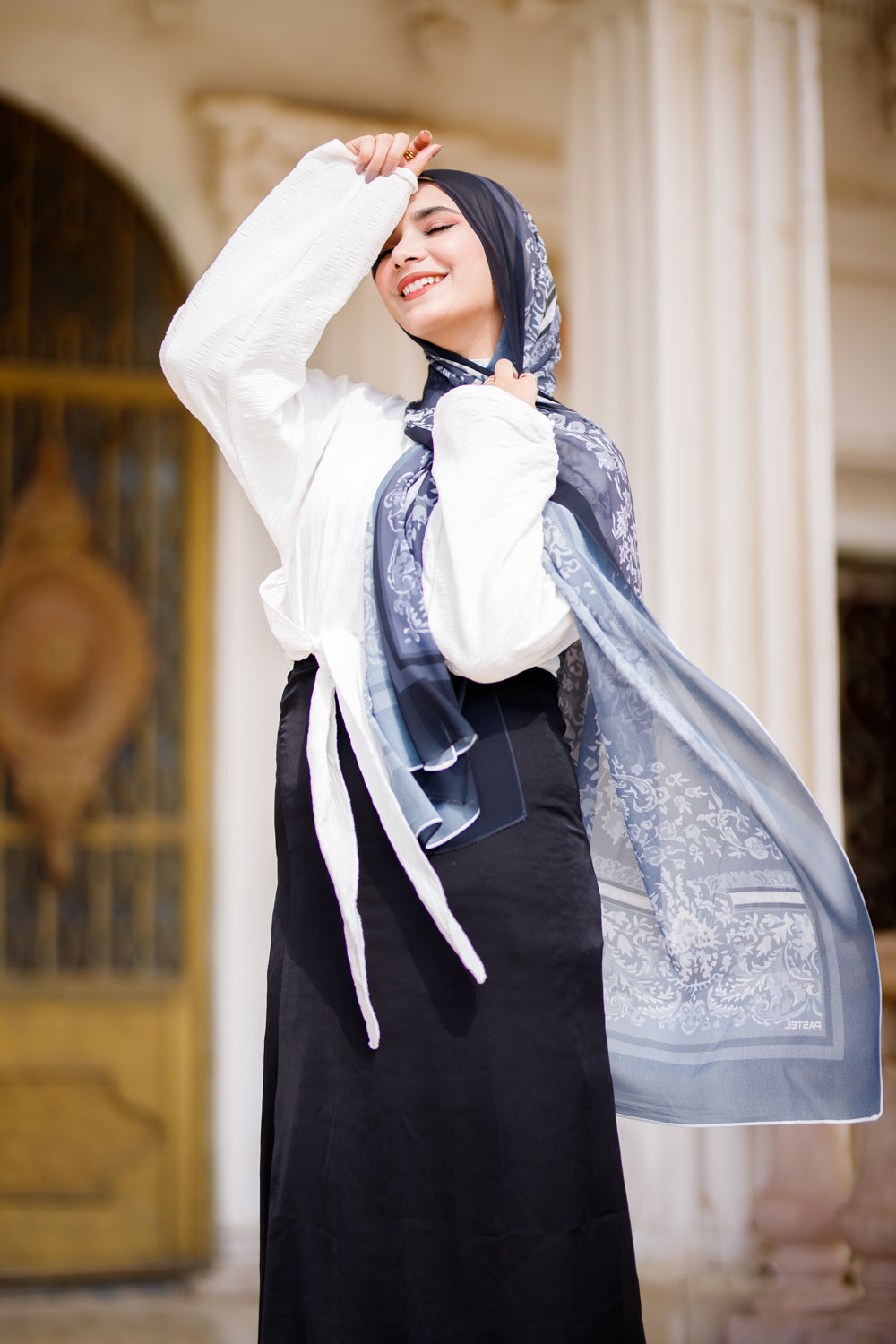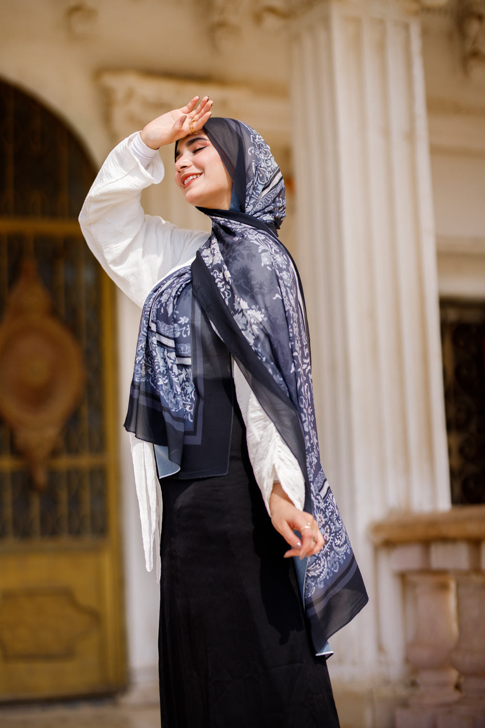 تفاصيل عربية متقنة بدرجات رمادية وفضية دخانية تُذكّر بفخامة القصور الشرقية. بزخارفها الراقية، تُضفي لمسةً فخمةً على الإطلالات الكلاسيكية والمعاصرة.