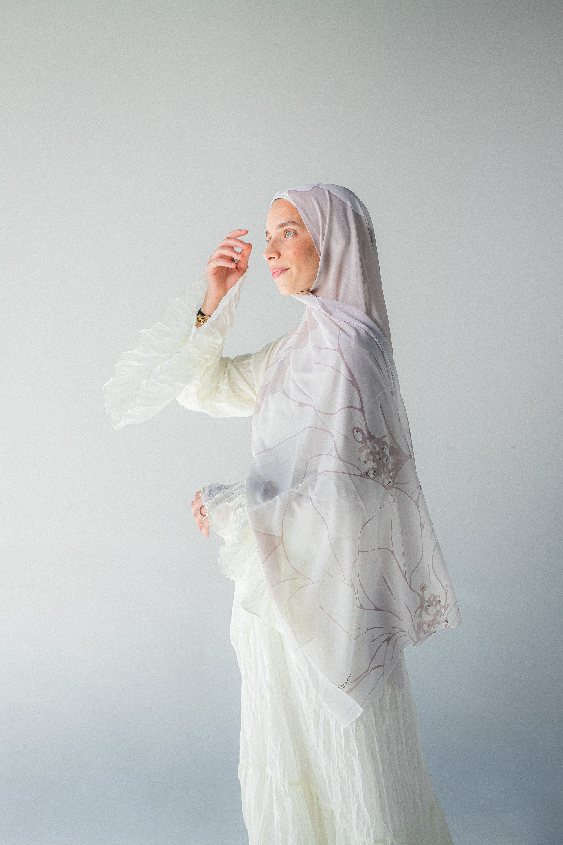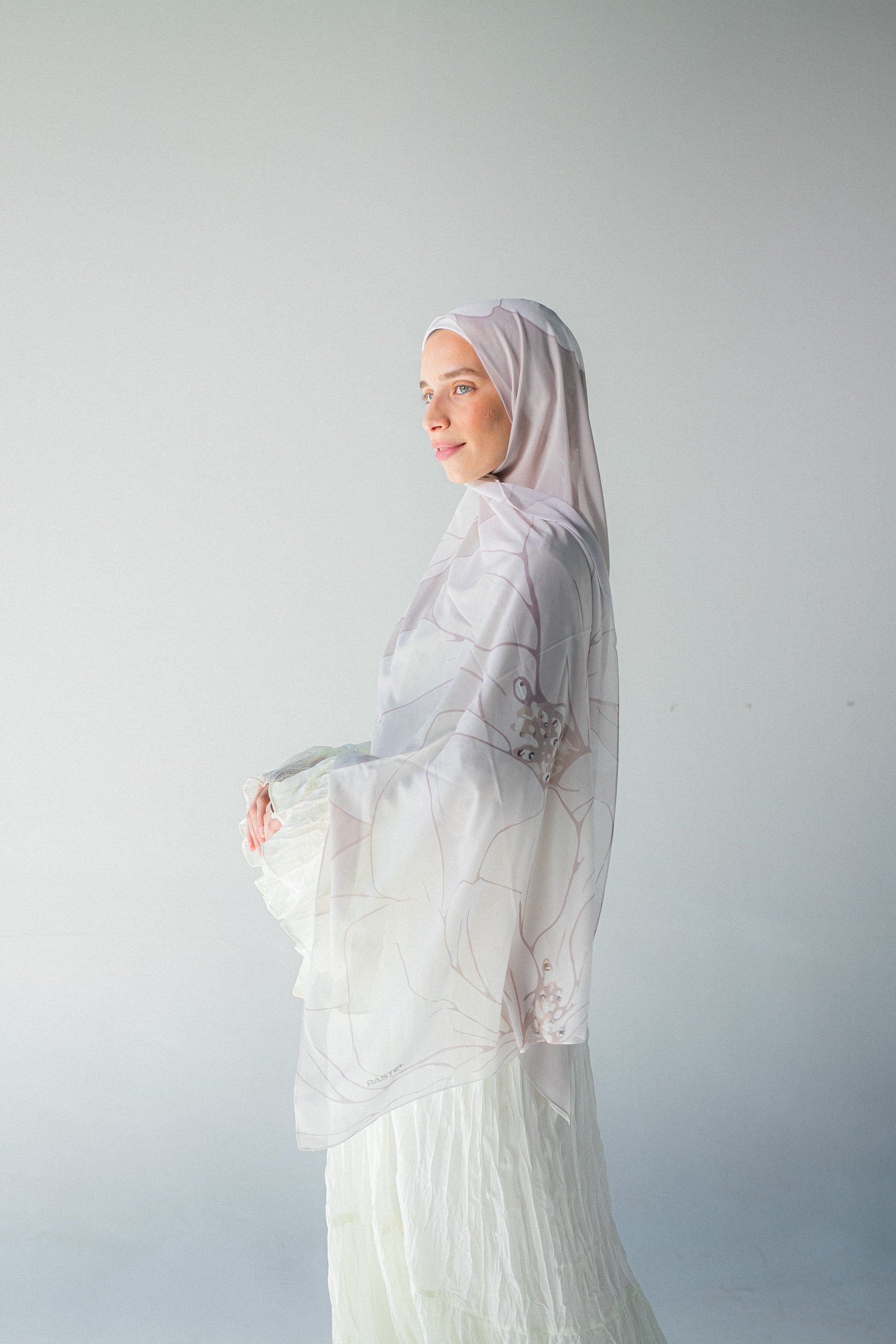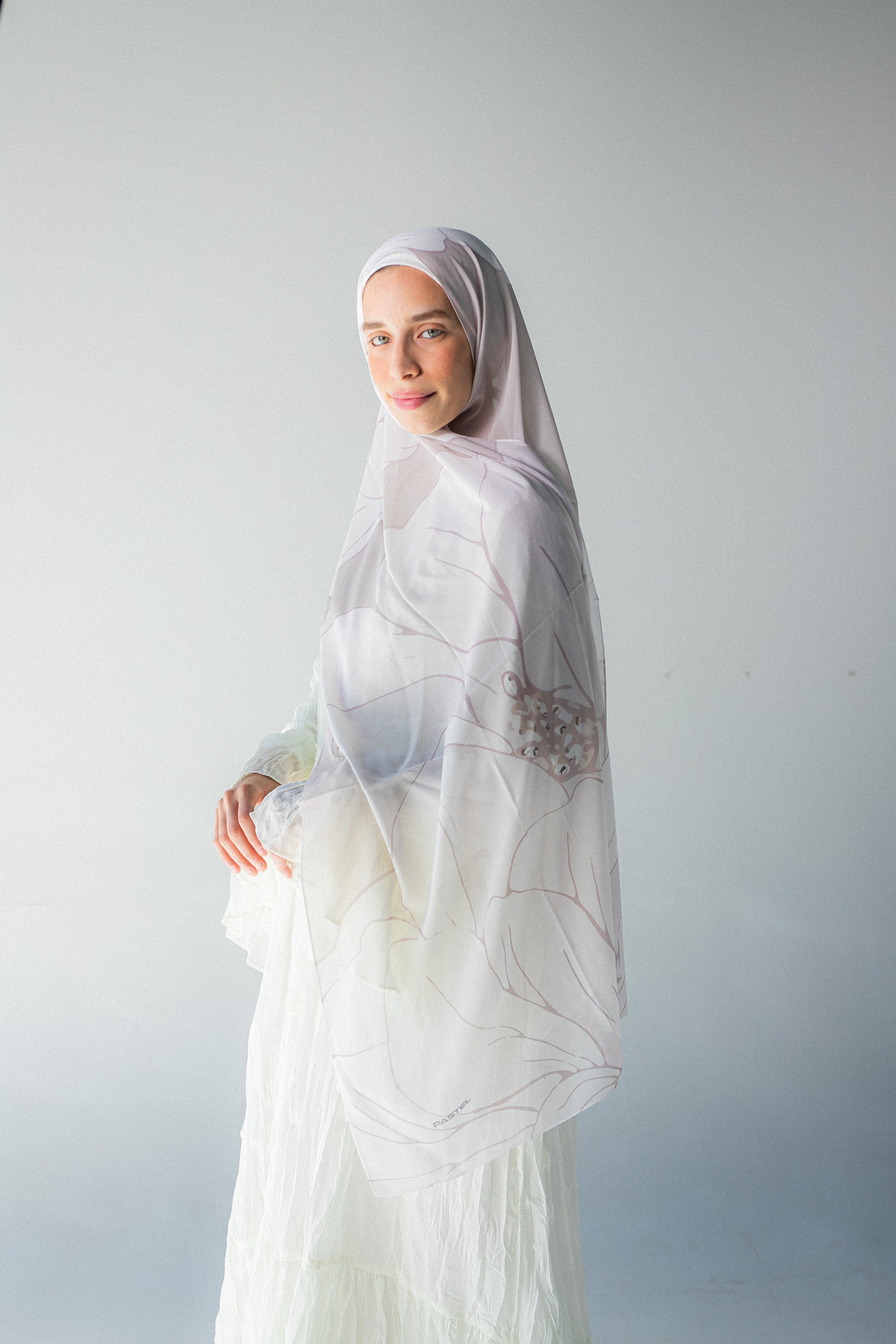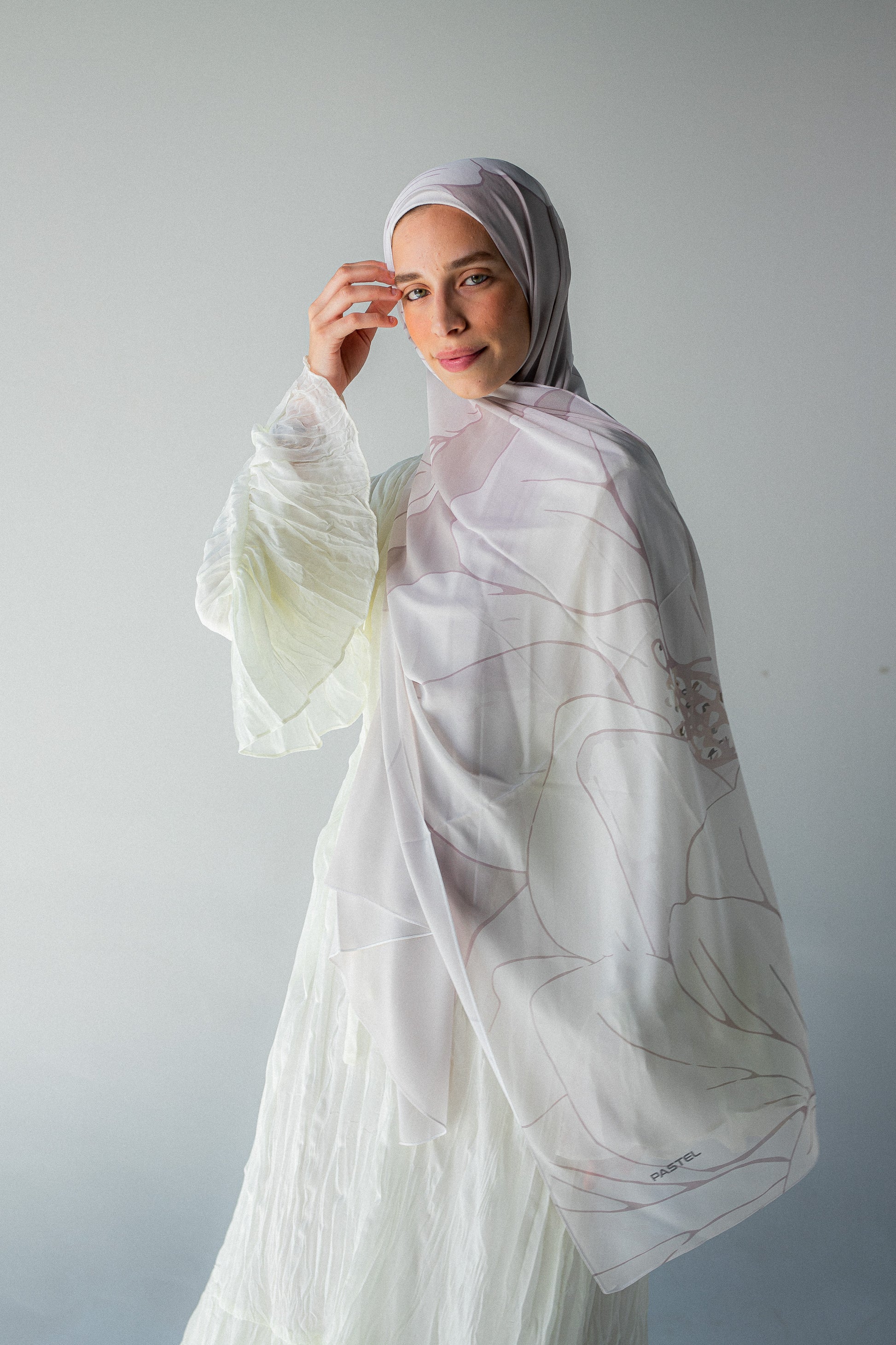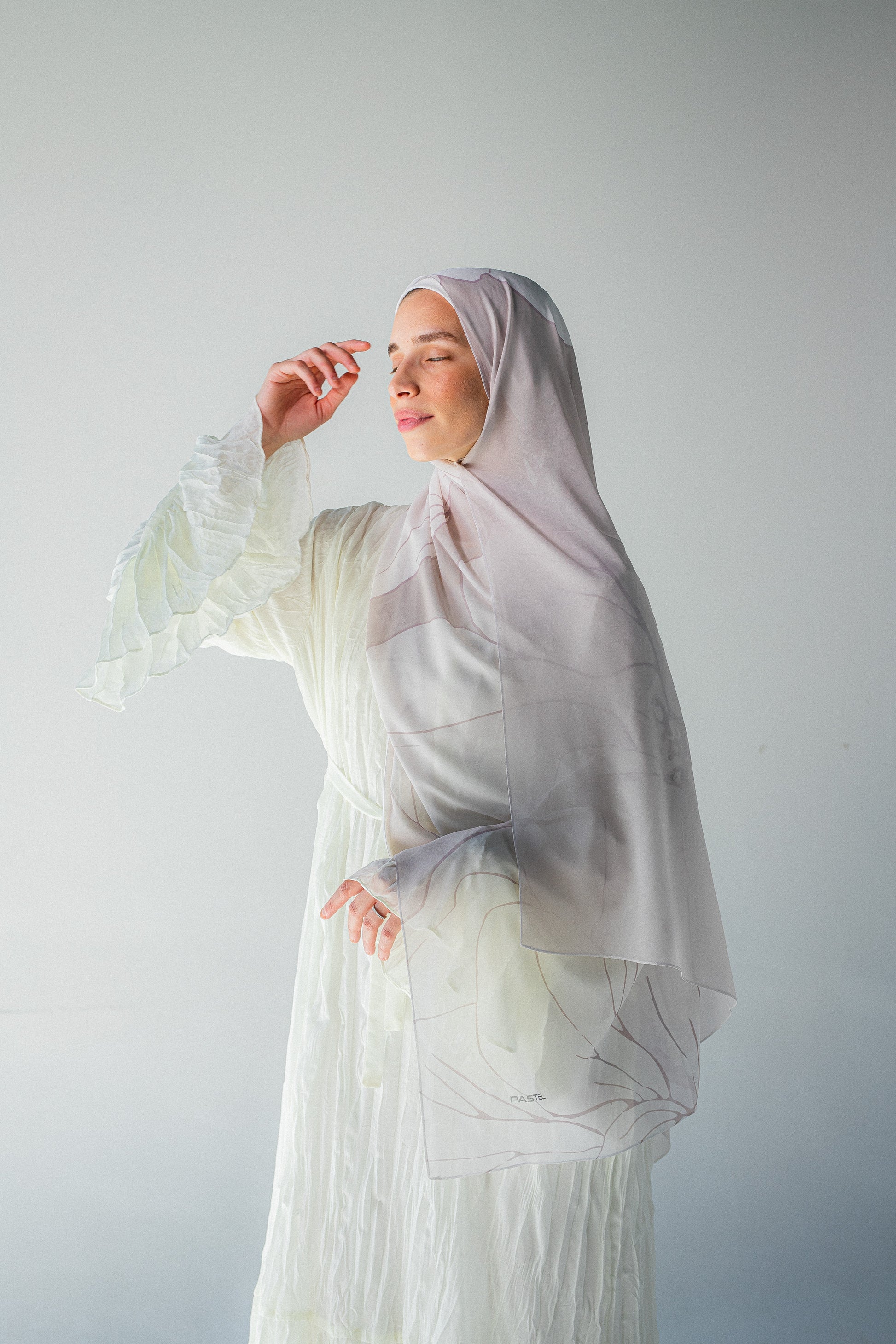 أزهار بيضاء كبيرة تتلاشى بنعومة على خلفية تدرج لوني بيج ناعم، مما يُضفي لمسة من الرقي الهادئ. هذا التصميم مثالي لإطلالة بسيطة وأنيقة، ويأسر الألباب بأناقة هادئة وبسيطة.