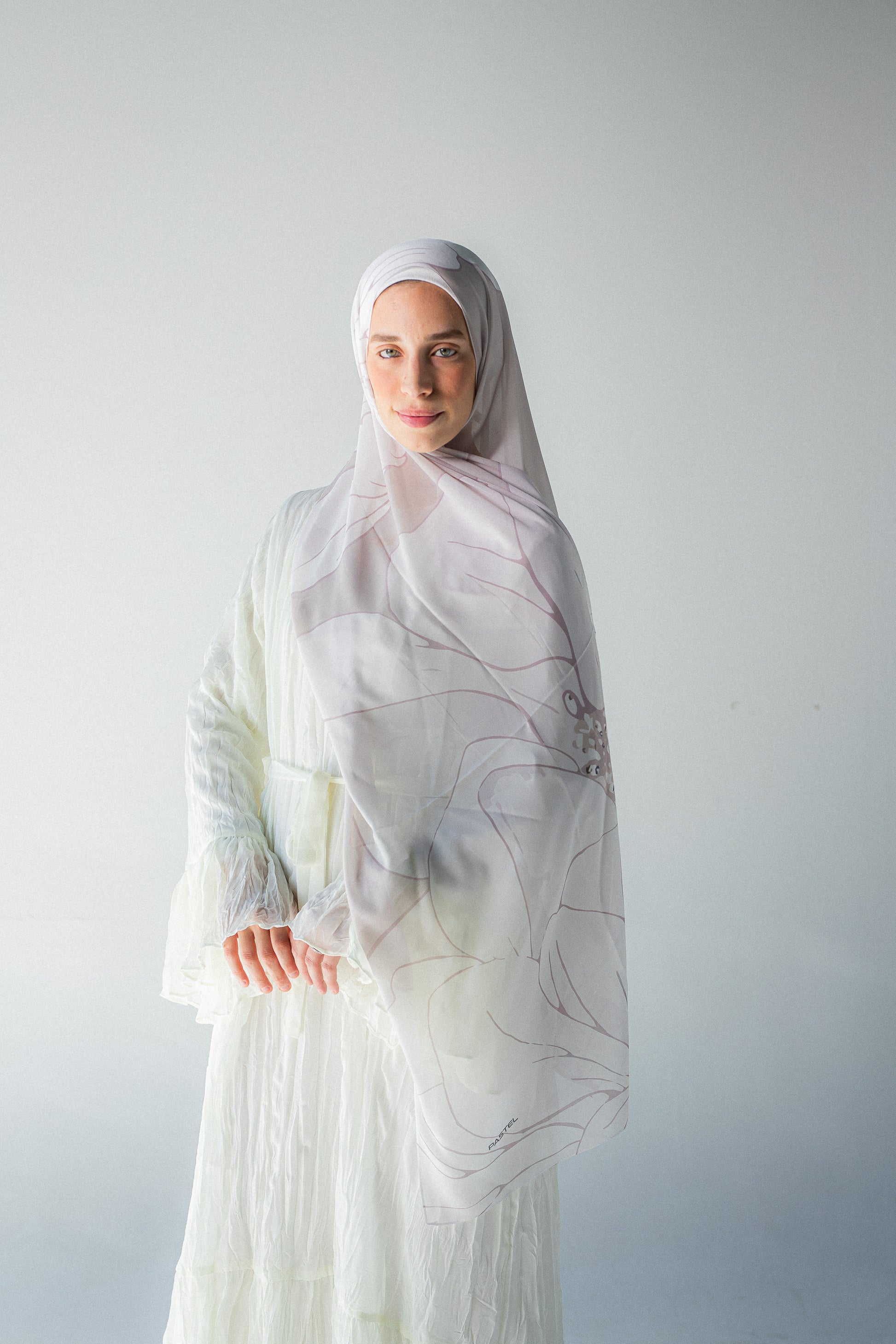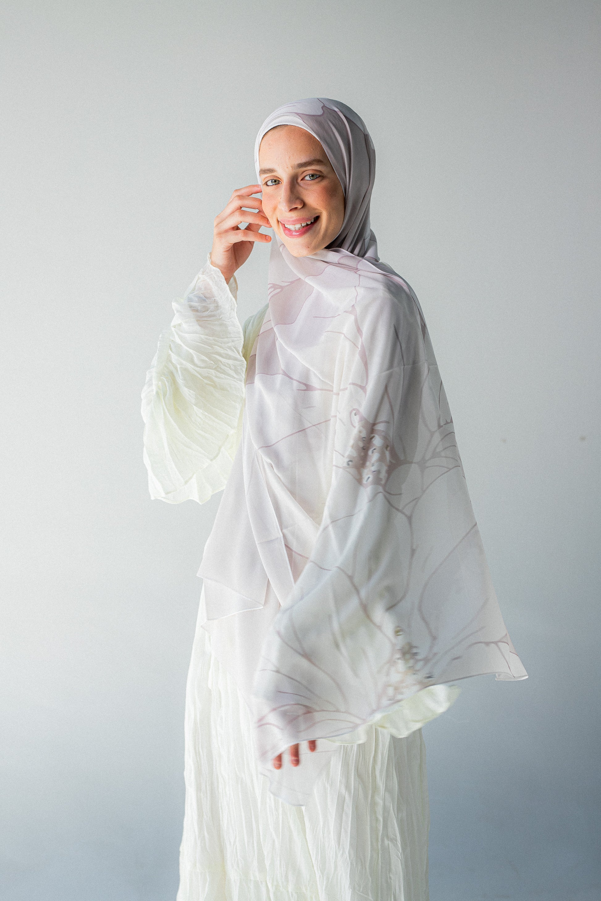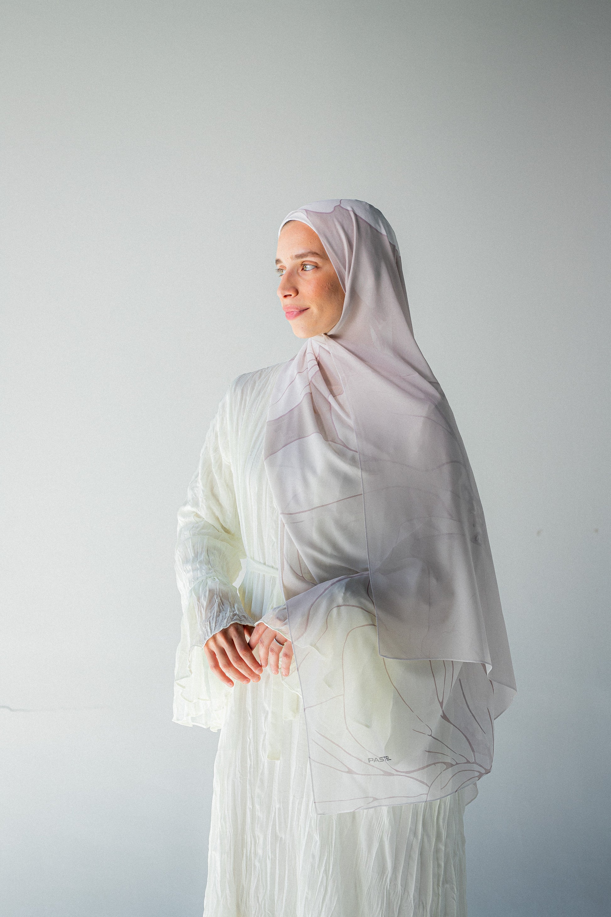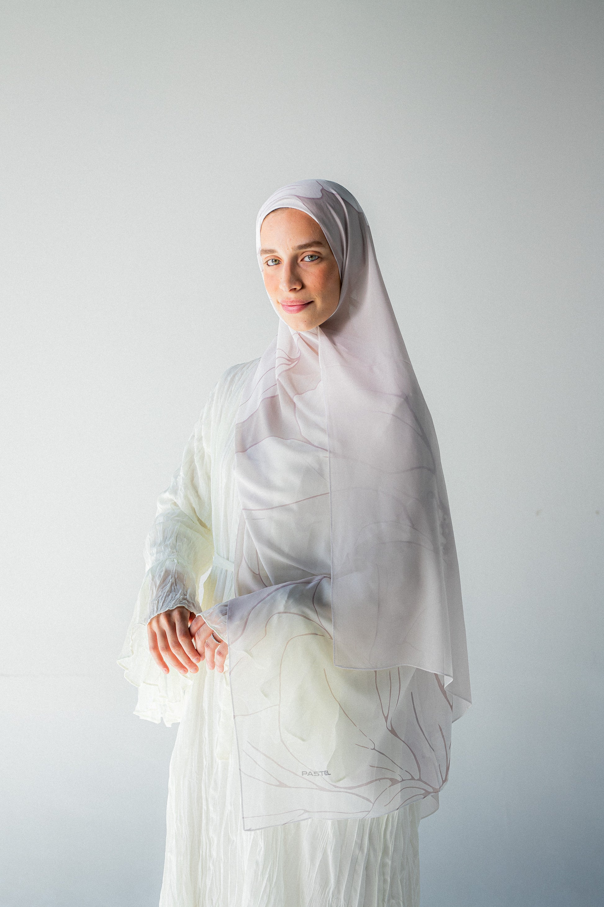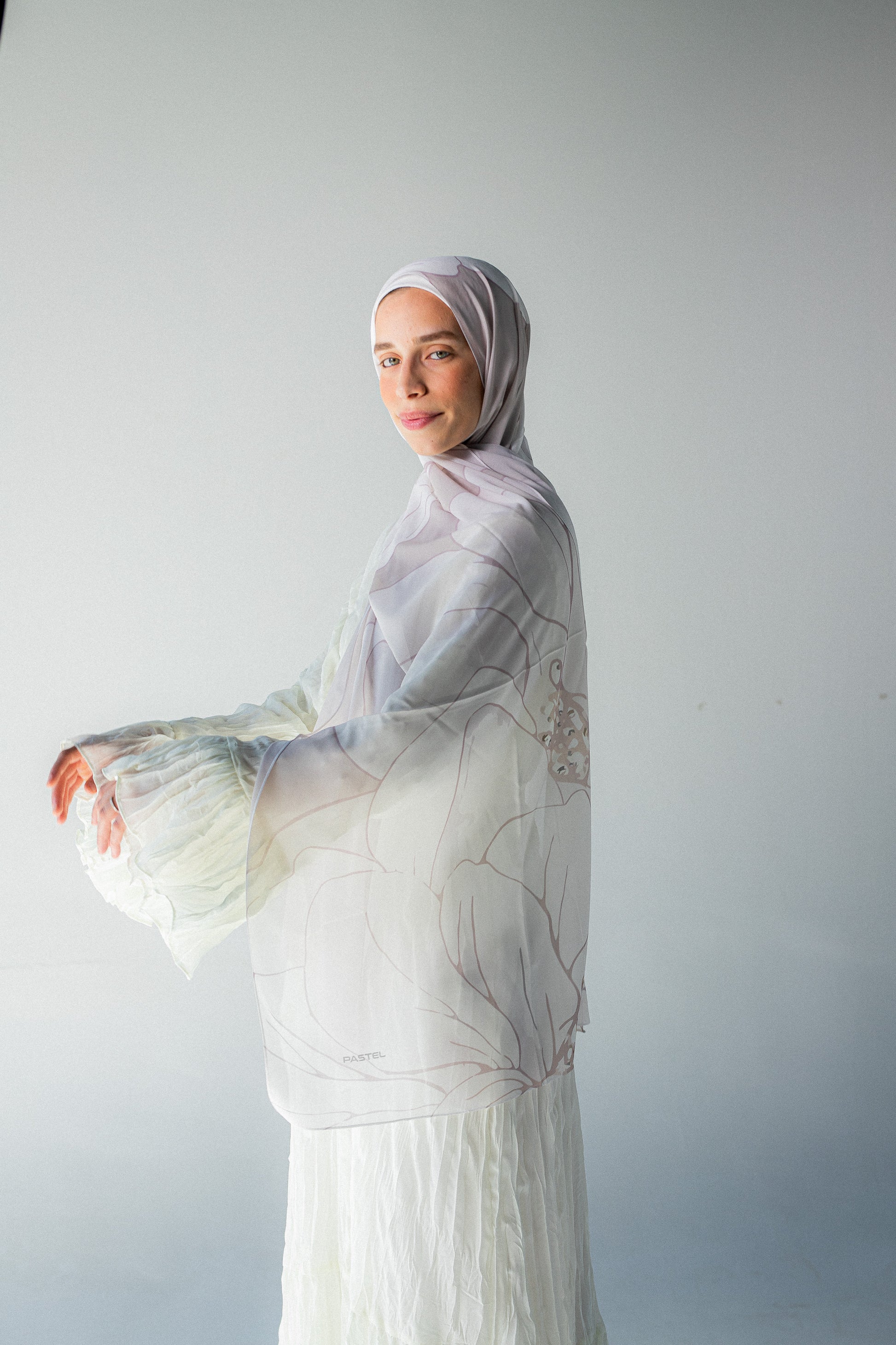 أزهار بيضاء كبيرة تتلاشى بنعومة على خلفية تدرج لوني بيج ناعم، مما يُضفي لمسة من الرقي الهادئ. هذا التصميم مثالي لإطلالة بسيطة وأنيقة، ويأسر الألباب بأناقة هادئة وبسيطة.