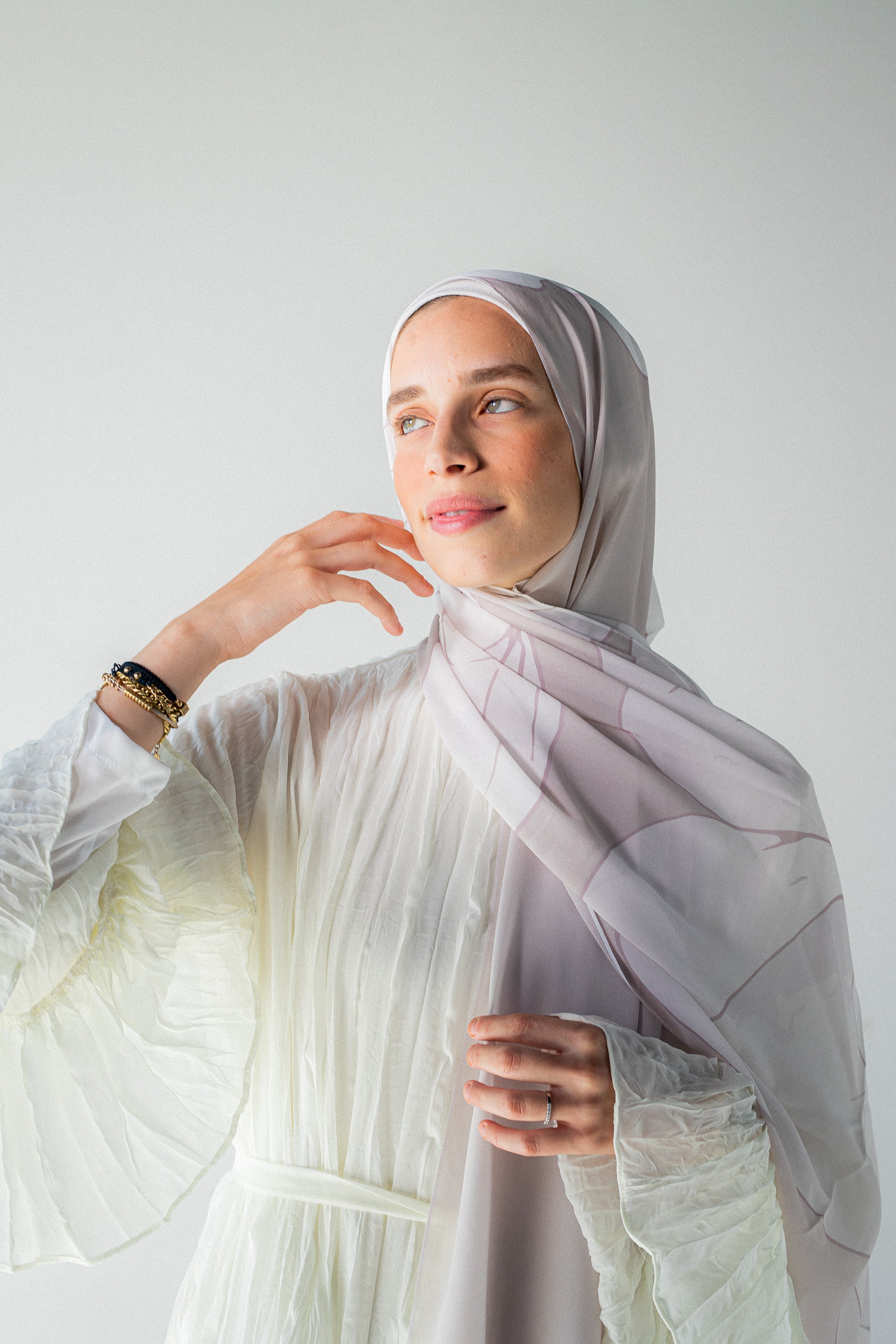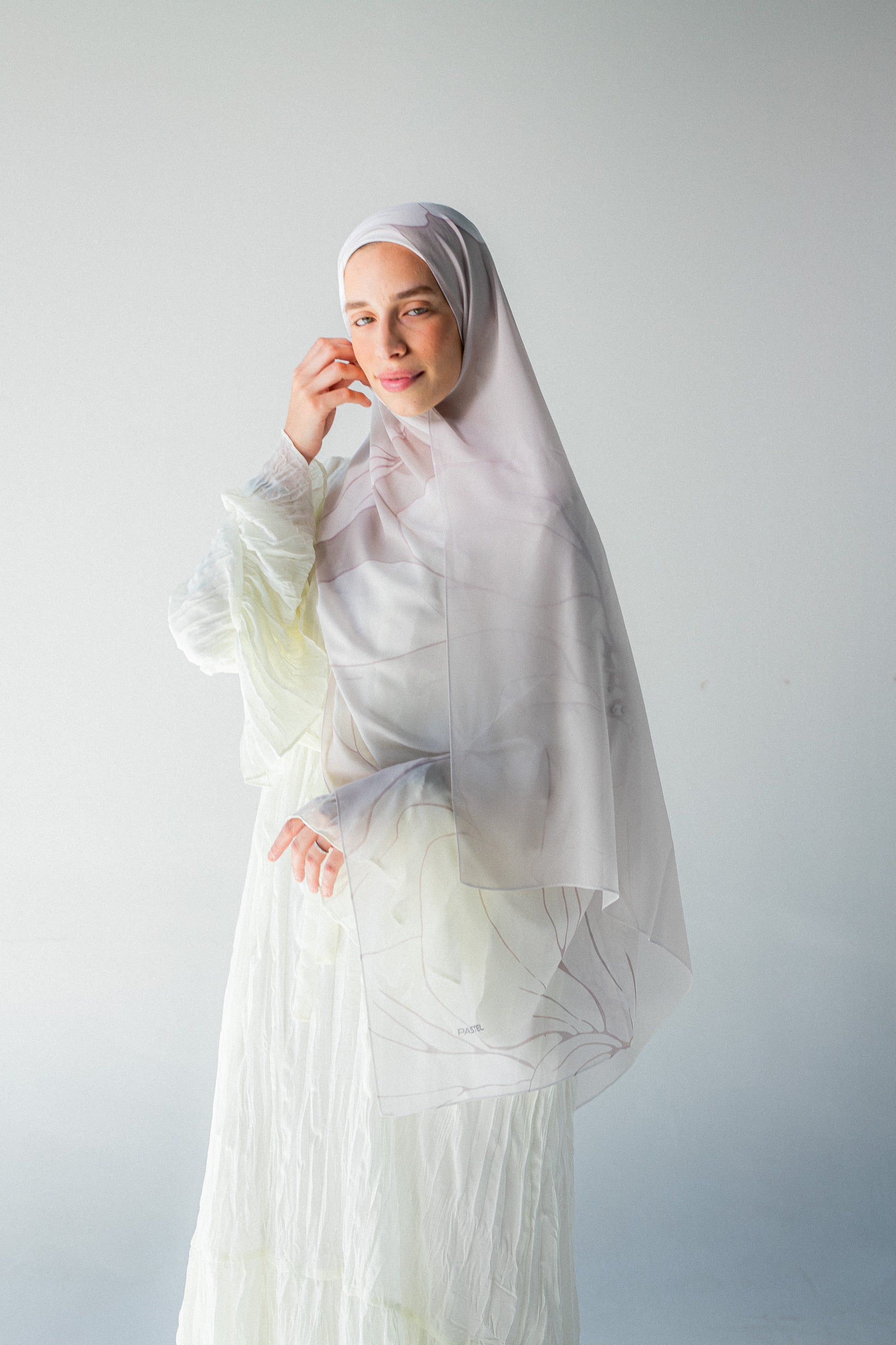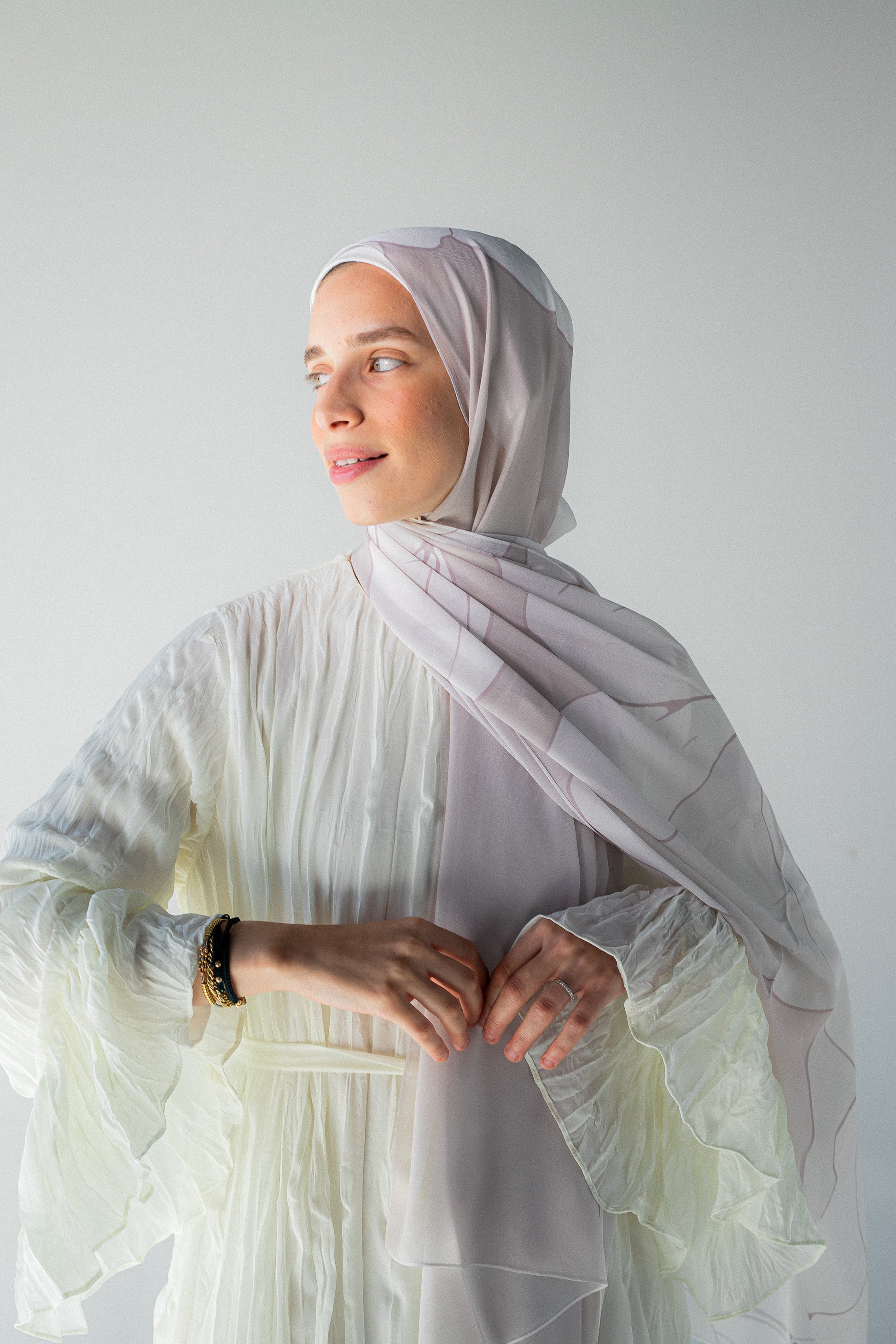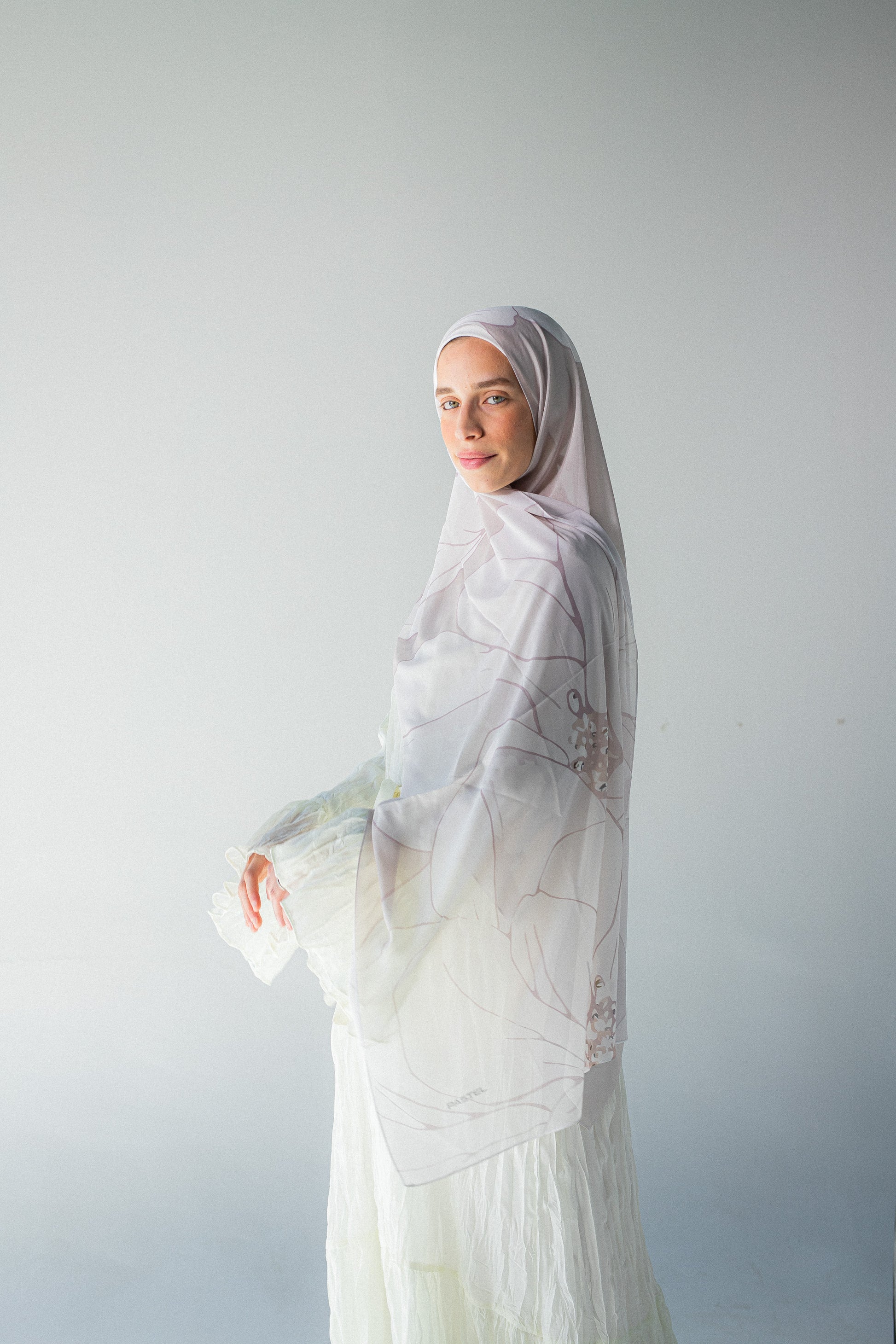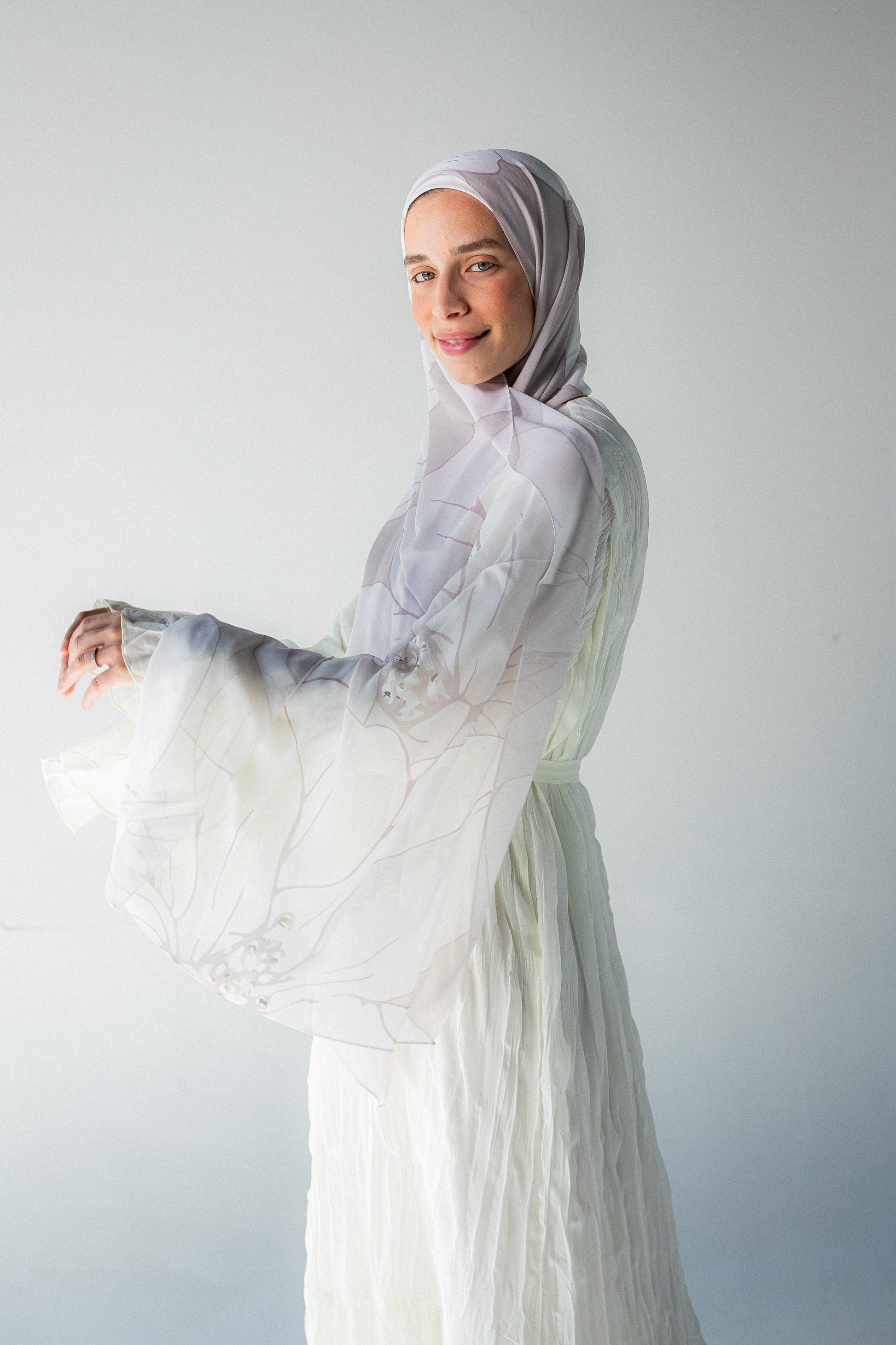 أزهار بيضاء كبيرة تتلاشى بنعومة على خلفية تدرج لوني بيج ناعم، مما يُضفي لمسة من الرقي الهادئ. هذا التصميم مثالي لإطلالة بسيطة وأنيقة، ويأسر الألباب بأناقة هادئة وبسيطة.