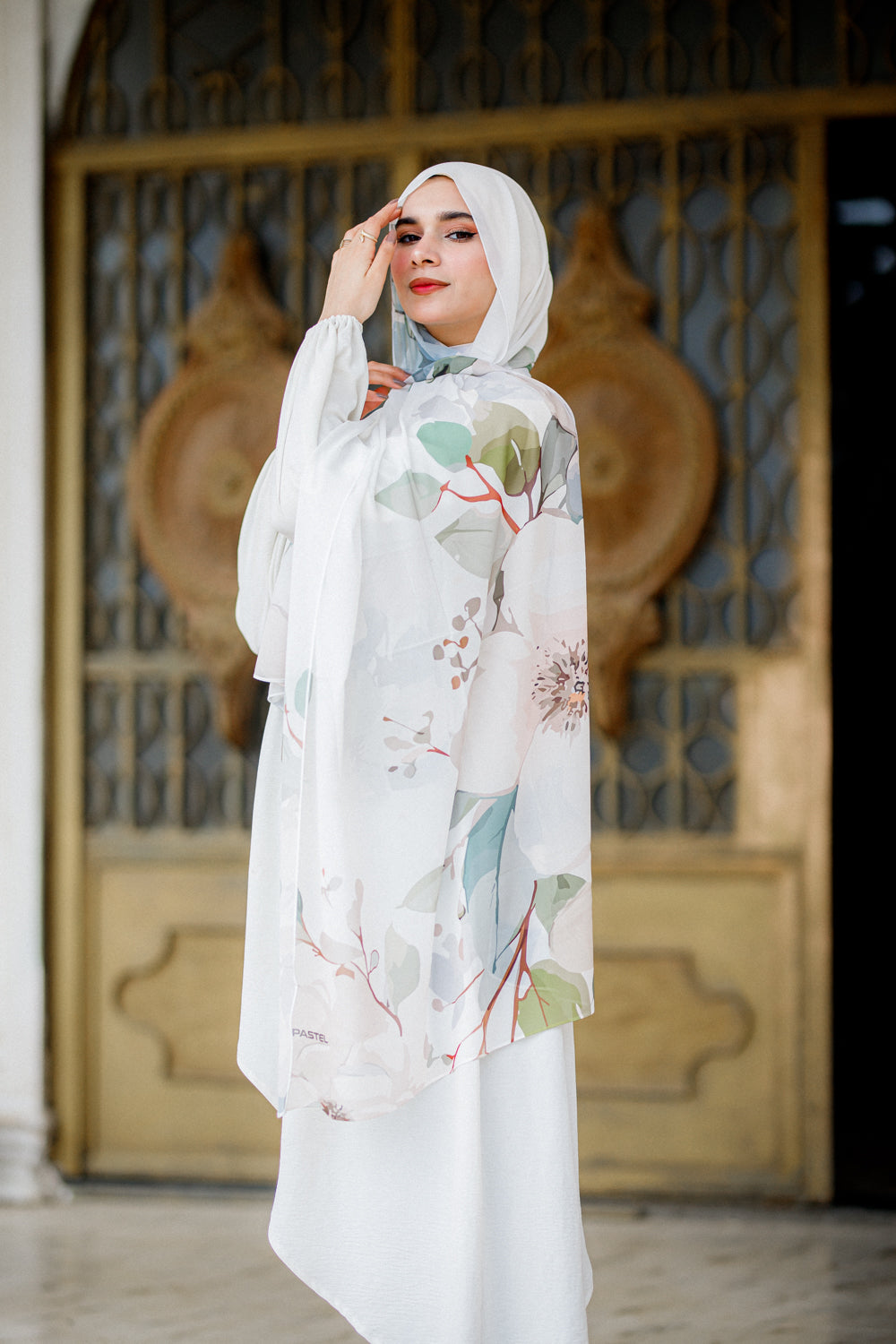أزهار بيضاء ناصعة وخضرة ناعمة تُحيط بالتصميم برقة، مما يُضفي عليه لمسةً منعشةً تُذكرنا بالغيوم الرقيقة. مثالية لإضفاء لمسةٍ رقيقة من السحر الطبيعي، وتُكمل بكل سهولة الإطلالات الكاجوال والأنيقة.