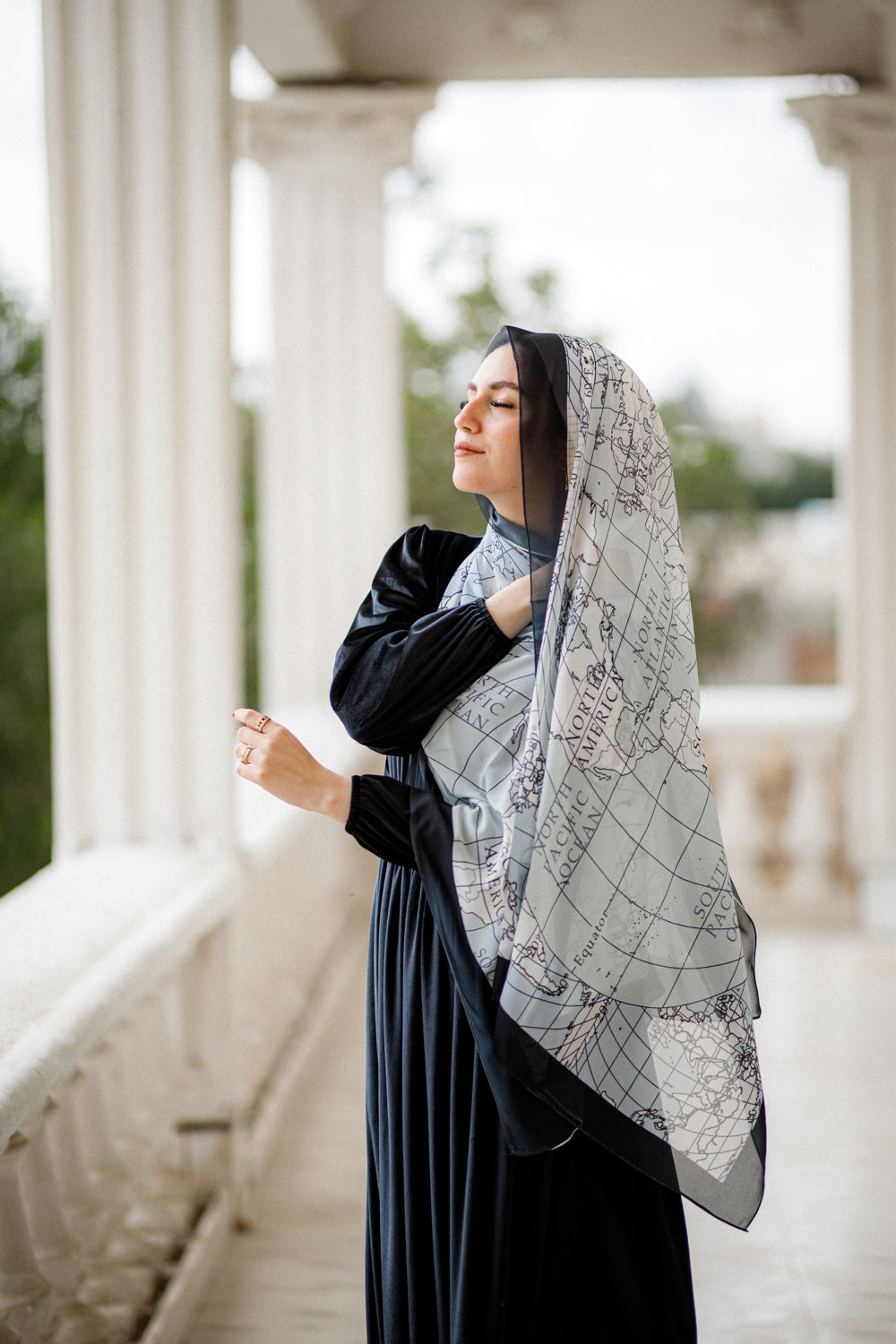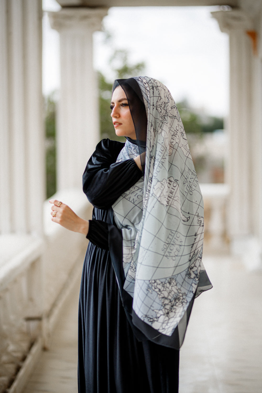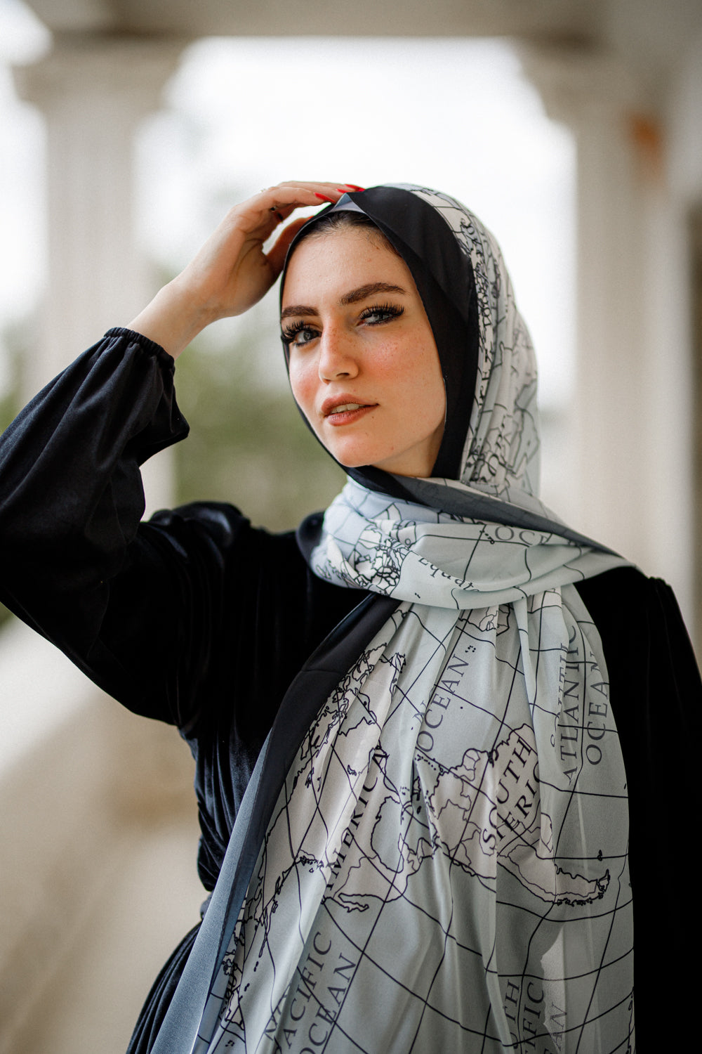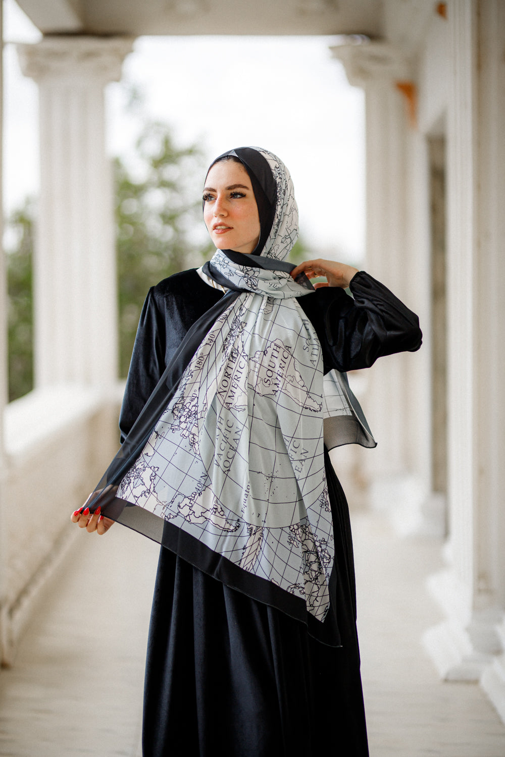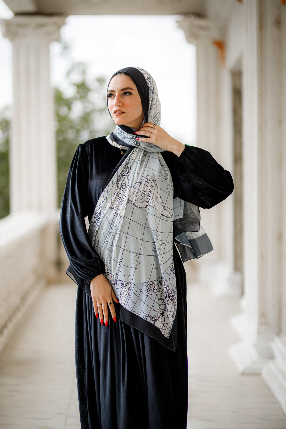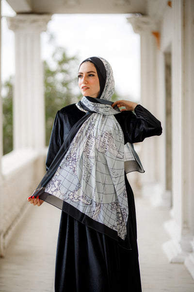 A stylish global map in soft aqua grid lines against bold black edges. Ideal for the wanderlust spirit, it adds a unique, worldly flair to your ensemble.