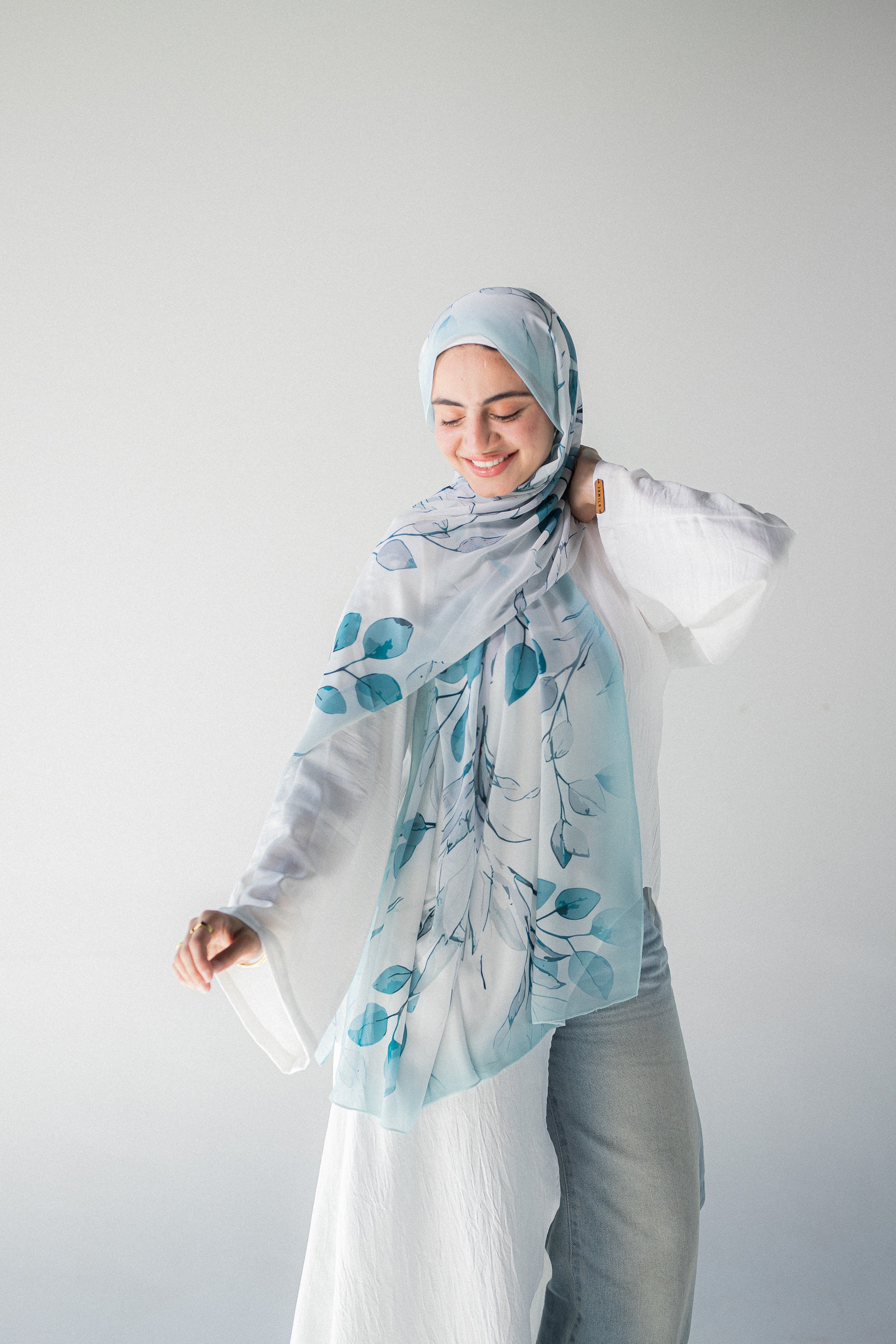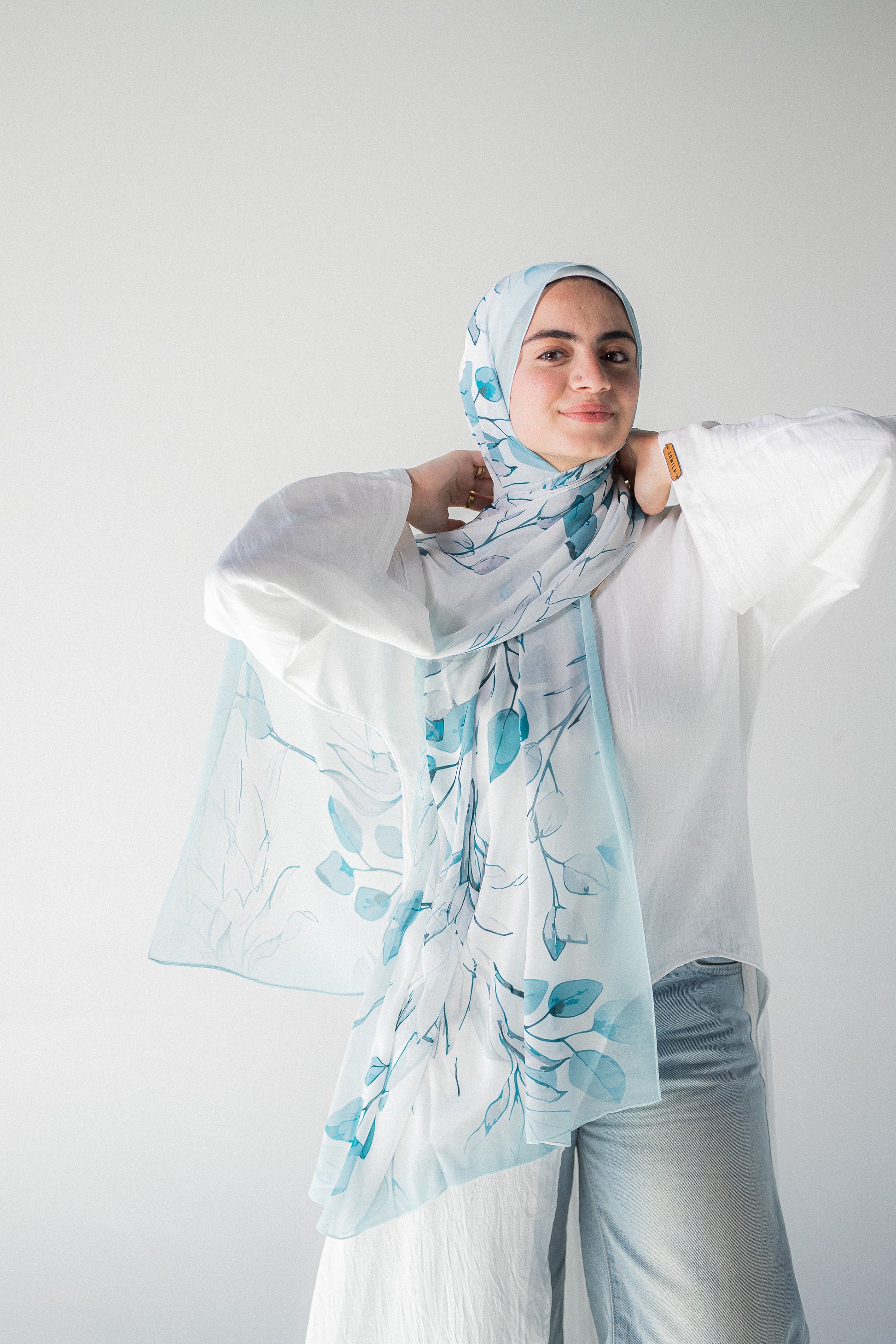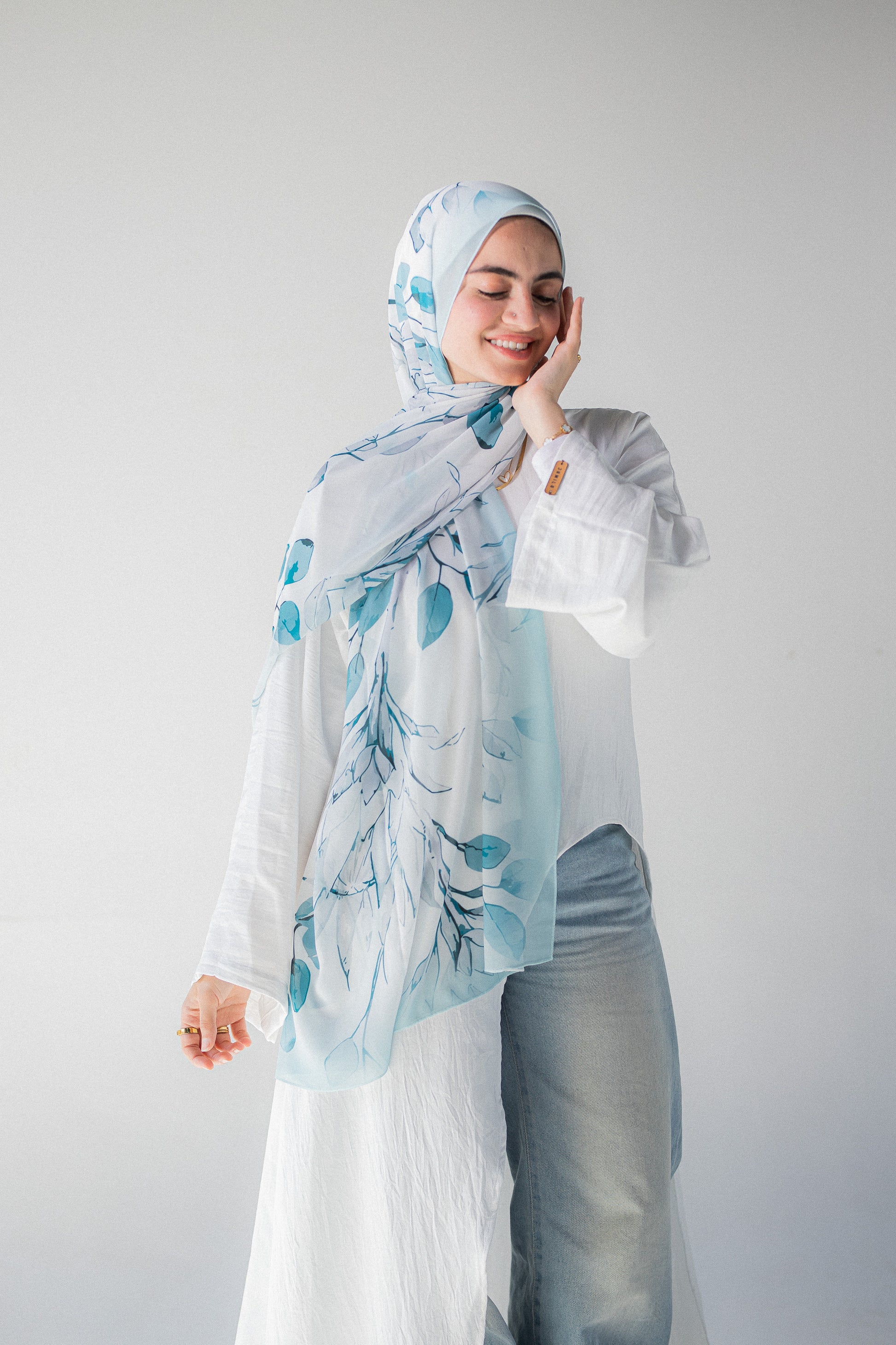 Crafted from luxurious chiffon (70×200 cm), this scarf showcases delicate blue floral patterns over a crisp white background, creating a fresh and luminous style.