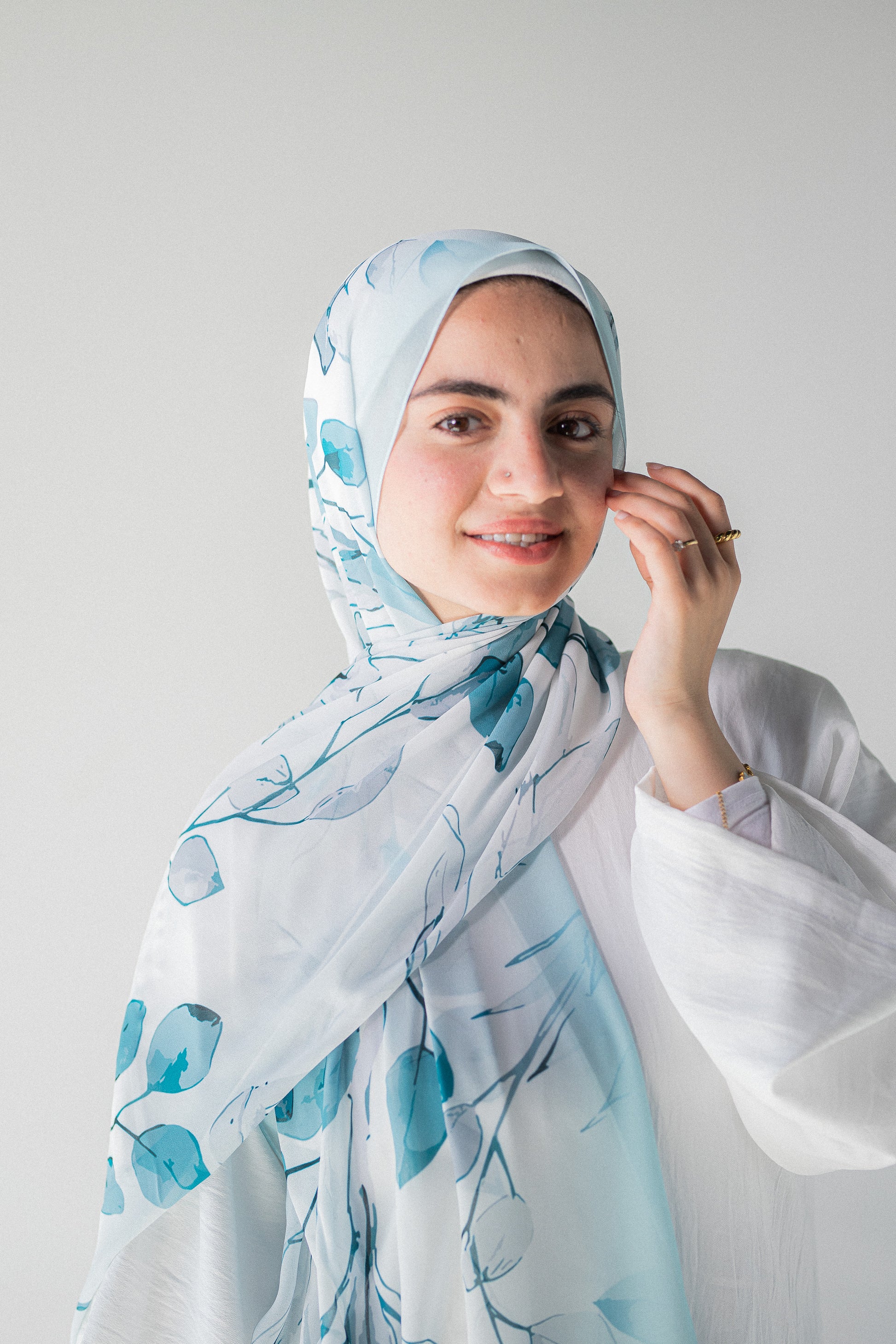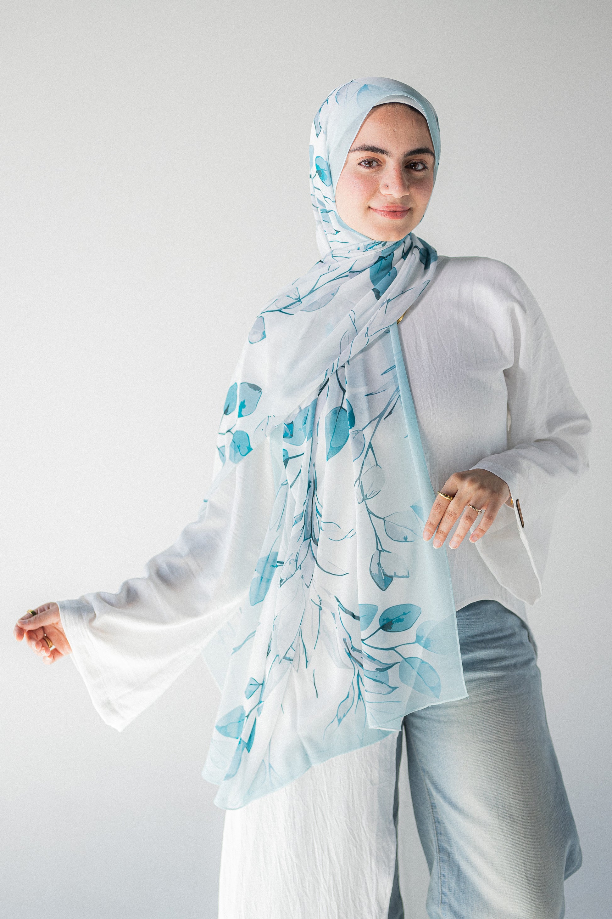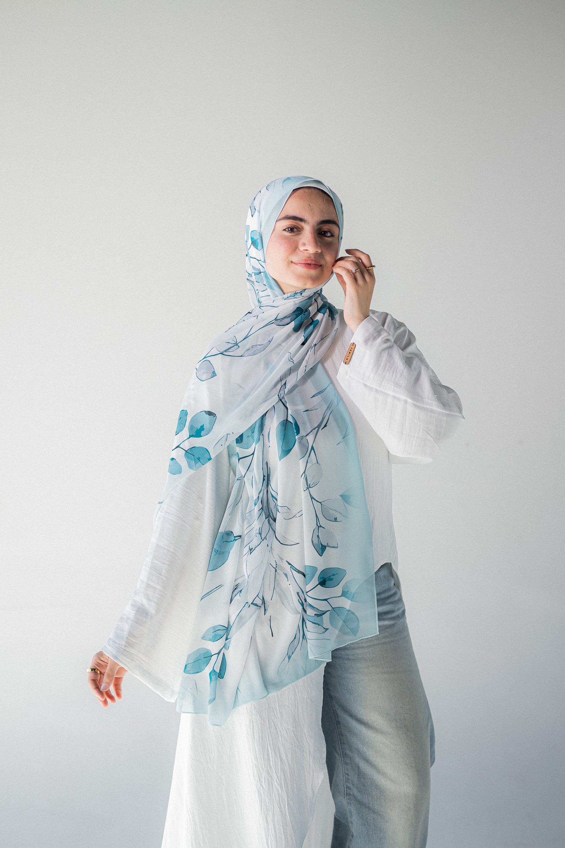 Crafted from luxurious chiffon (70×200 cm), this scarf showcases delicate blue floral patterns over a crisp white background, creating a fresh and luminous style.