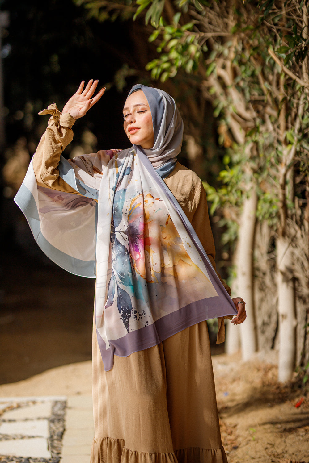 Introducing Raheeq, a stunning printed chiffon scarf crafted for the woman who loves elegance with a touch of art.