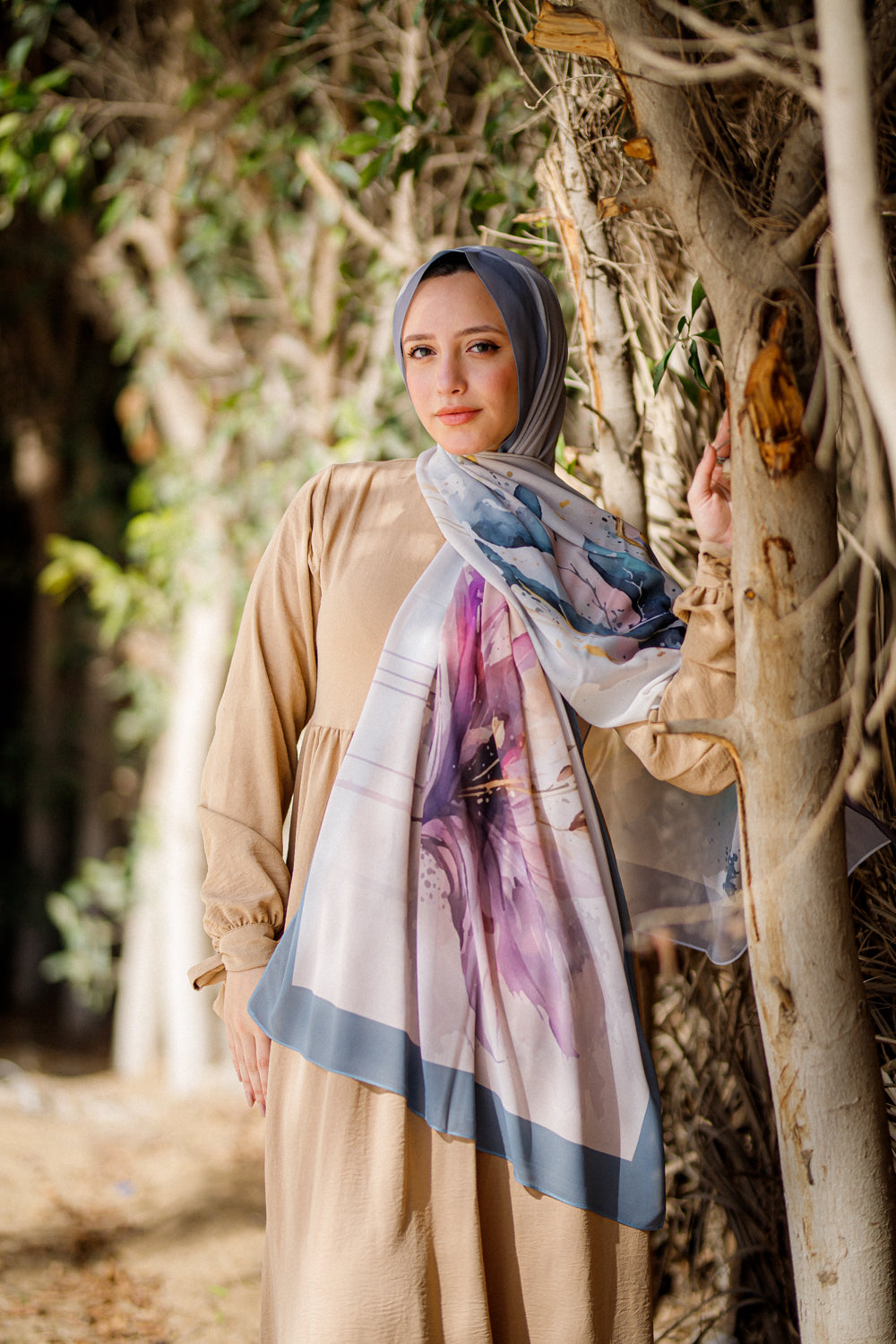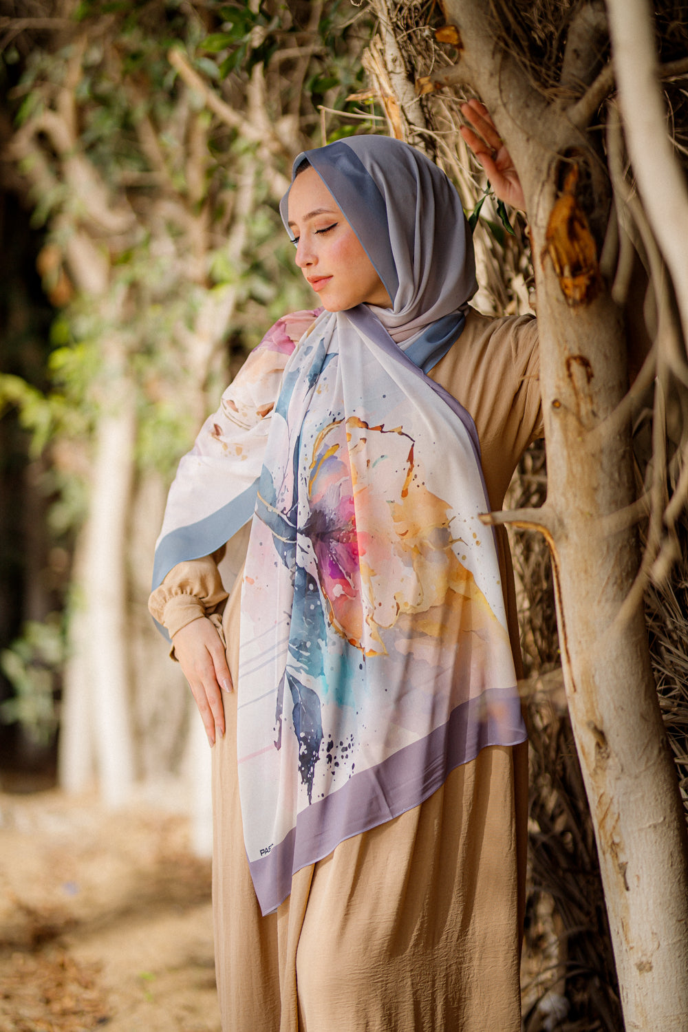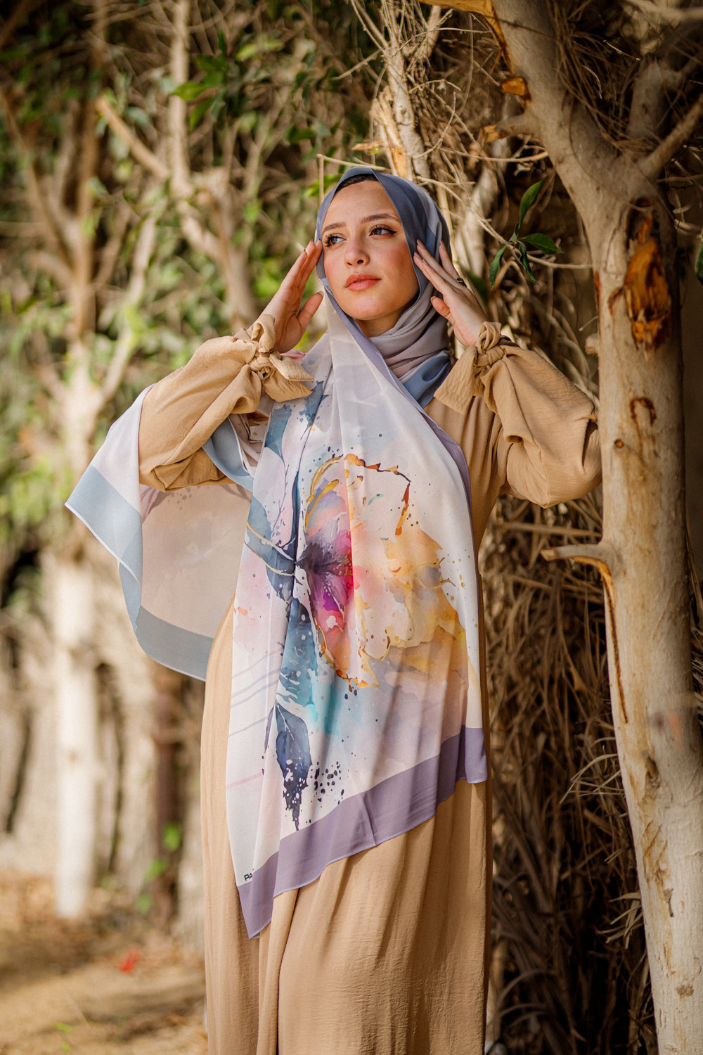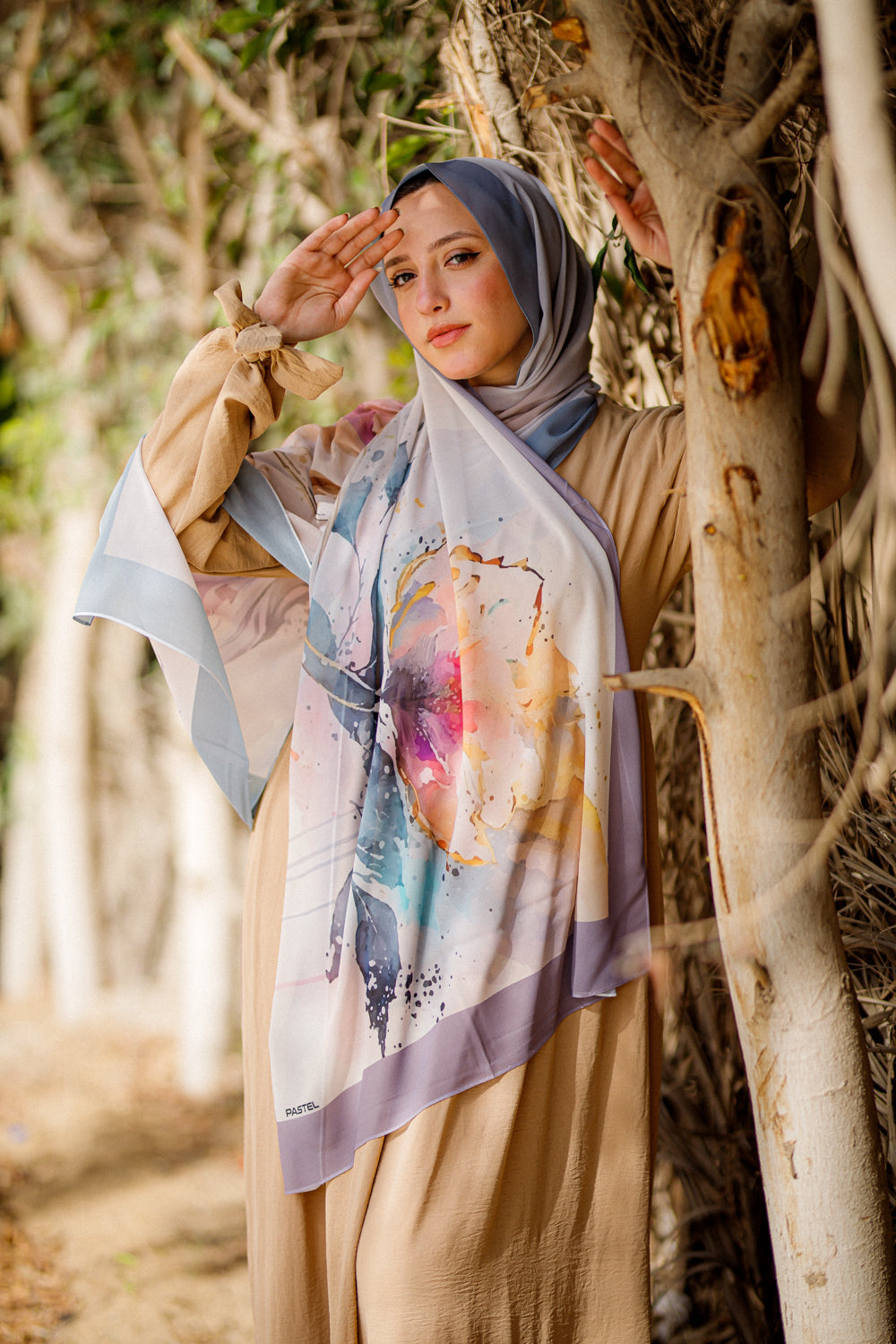 Its delicate watercolor design blends soft mauve, blue, and beige hues, giving your outfit a graceful and modern charm.
